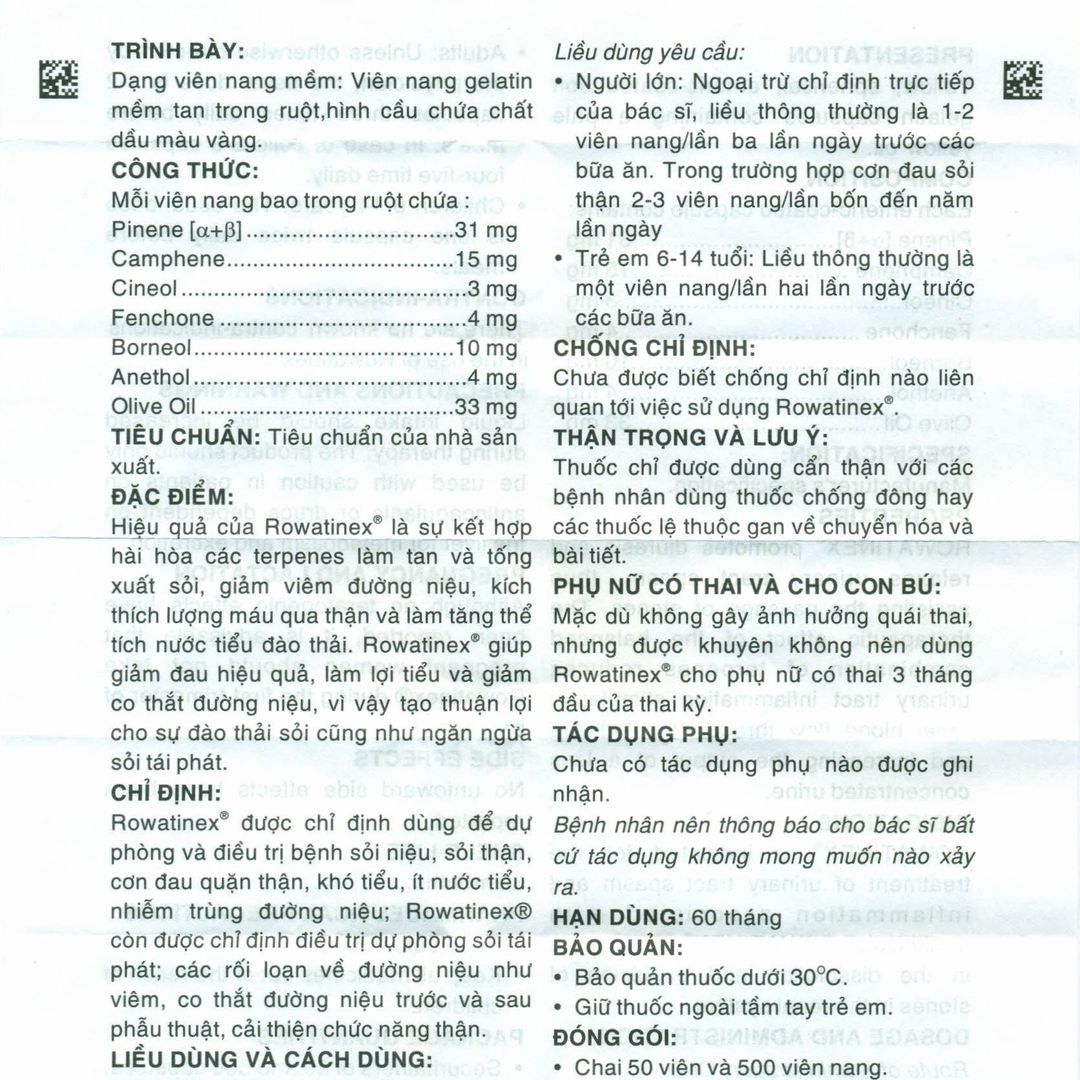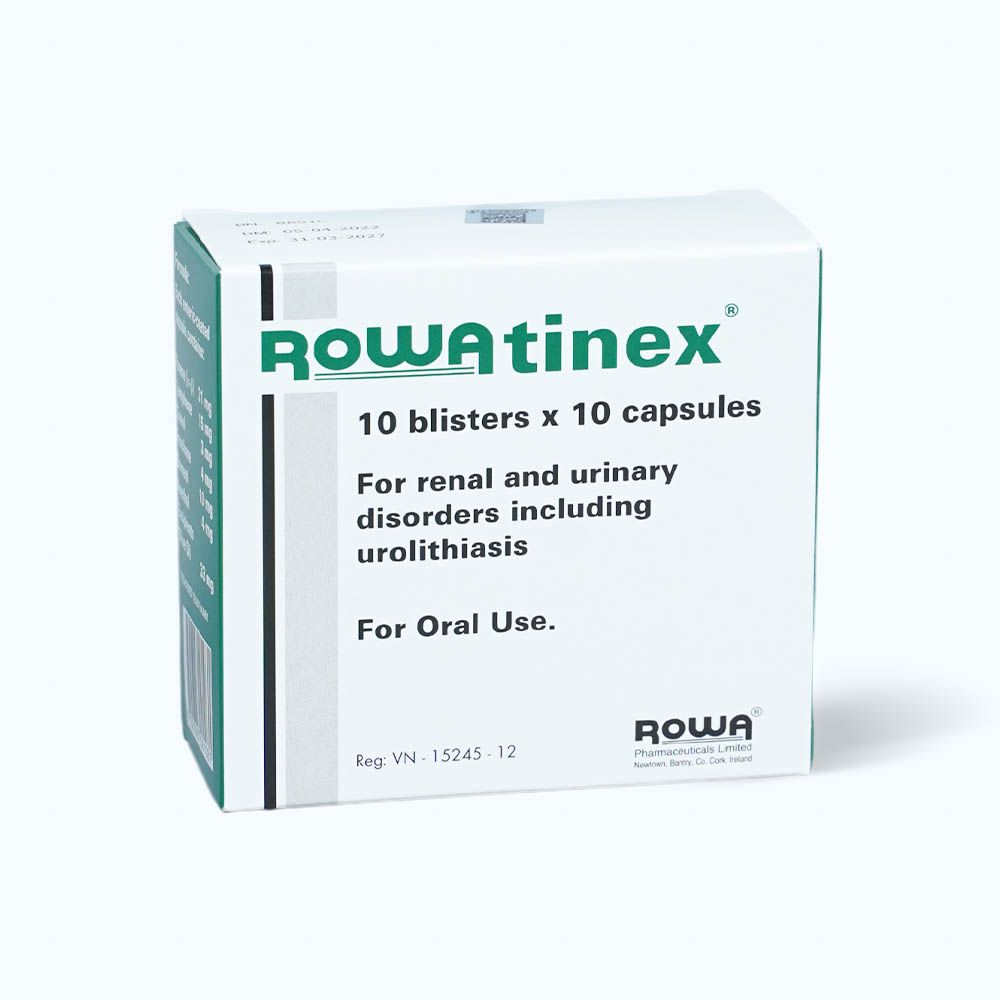Rowatinex® là sản phẩm của Rowa Pharmaceuticals Limited, Ireland, được chế tạo dưới dạng viên nang gelatin mềm tan trong ruột. Thuốc chứa các thành phần Terpenes kết hợp hài hòa, có tác dụng hỗ trợ điều trị và phòng ngừa các bệnh liên quan đến sỏi niệu và sỏi thận. Sản phẩm được chỉ định cho những người gặp phải cơn đau quặn thận, khó tiểu, ít nước tiểu, nhiễm trùng đường niệu, cũng như các tình trạng co thắt đường niệu trước và sau phẫu thuật. Rowatinex® còn giúp cải thiện chức năng thận.