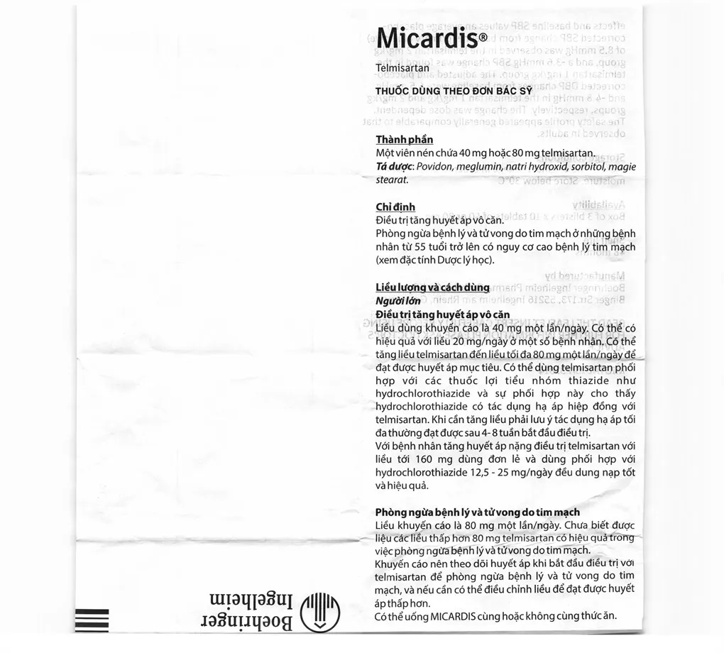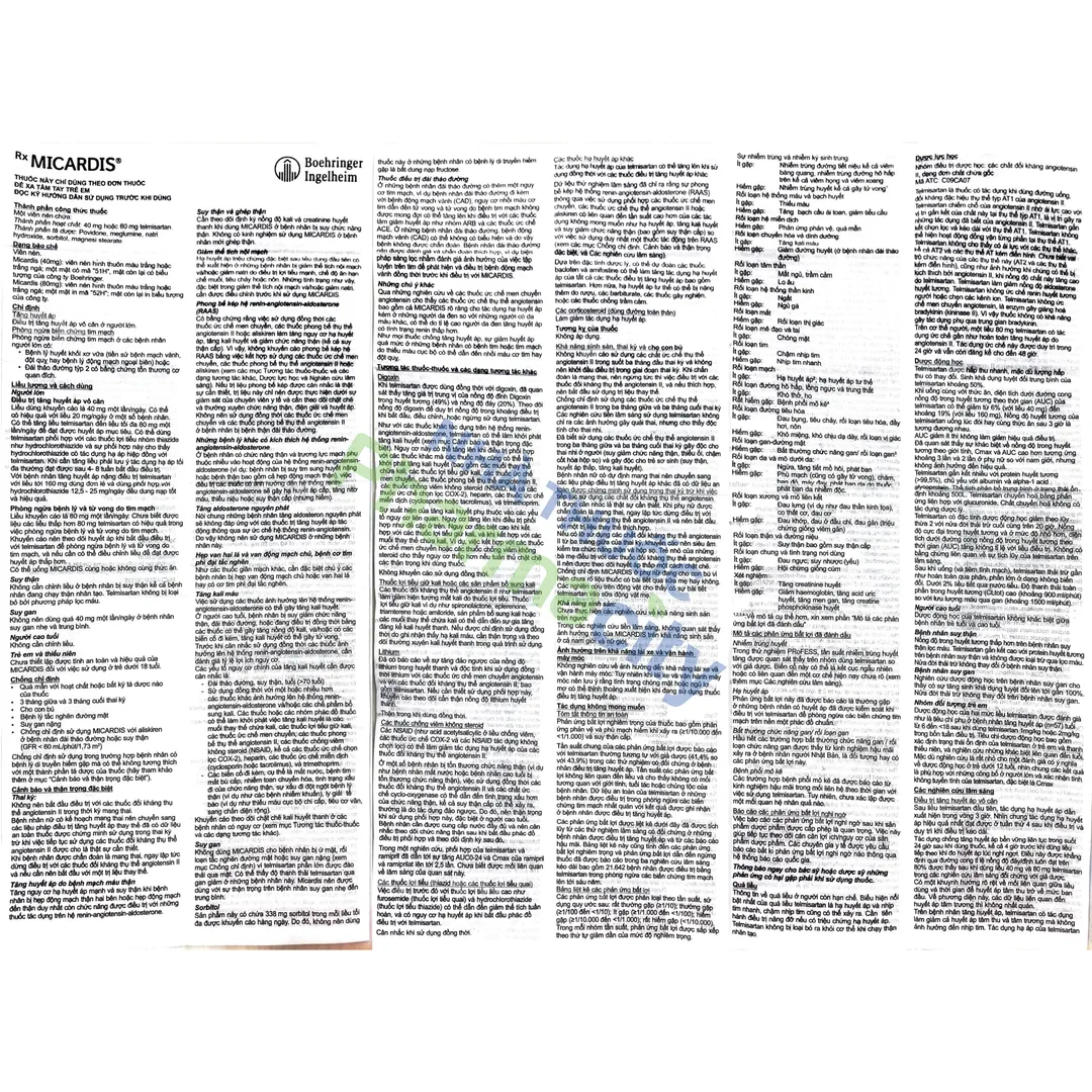 Viên nén Micardis 40mg được sản xuất bởiBoehringer Ingelheim Pharma GmbH Co. KG, với thành phần chính Telmisartan, là thuốc dùng để điều trị tăng huyết áp vô căn ở người lớn và phòng ngừa biến chứng tim mạch trong một số trường hợp.