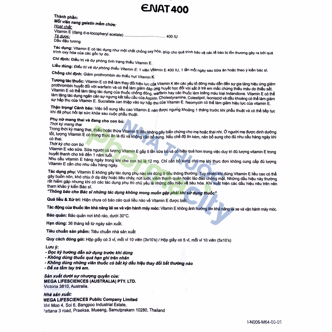 Viên nang Enat 400 IU giúp ngăn ngừa lão hóa da, điều trị dự phòng thiếu vitamin E (3 vỉ x 10 viên) có thể sử dụng chung với thuốc tránh thai hằng ngày,