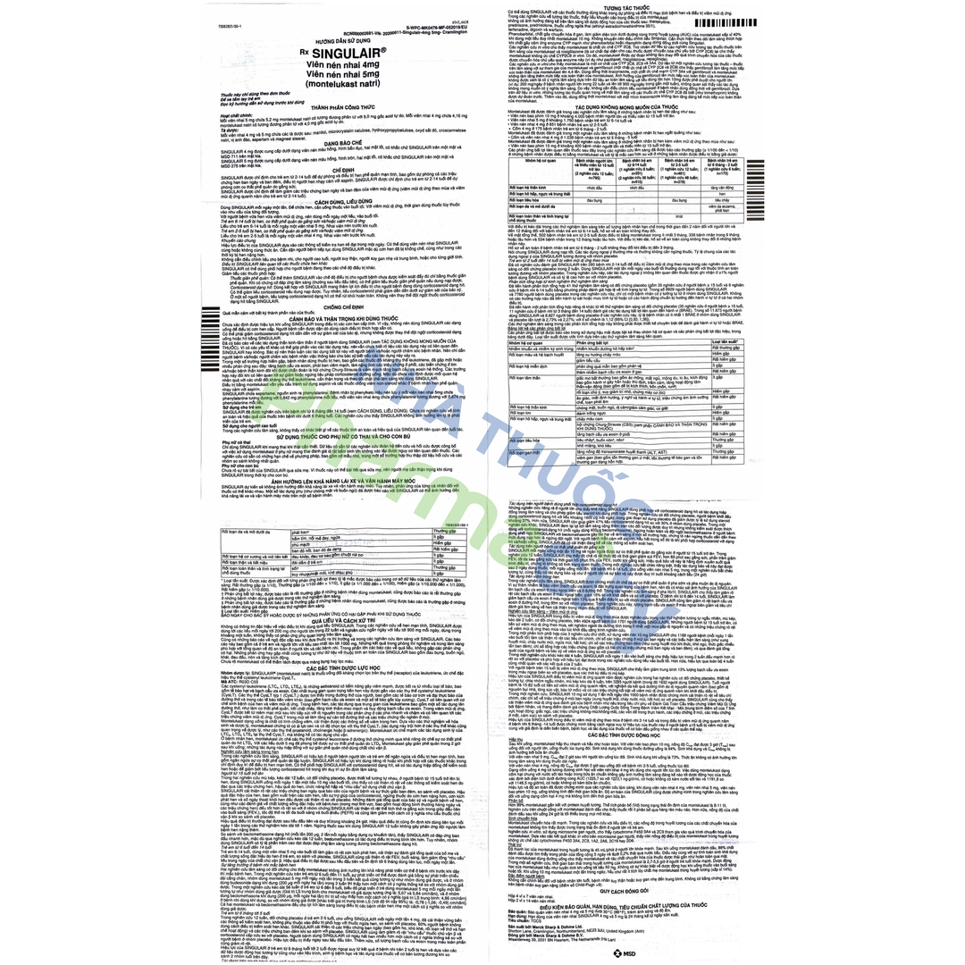 Singulair 5mg là sản phẩm của Công ty Dược phẩm MSD (Merck Sharp & Dohme), thành phần chính là montelukast (dưới dạng montelukast natri).