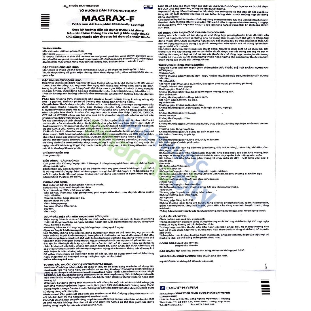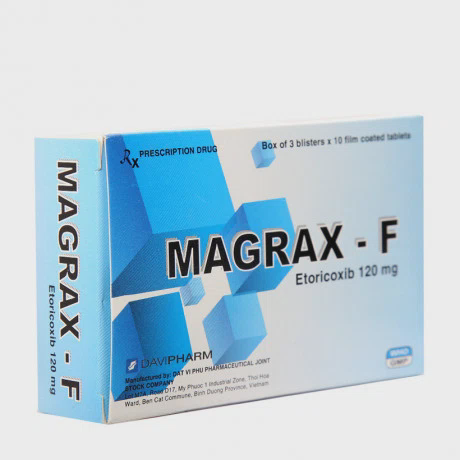 Magrax-F được sản xuất bởi Công ty Cổ phần Dược phẩm Đạt Vi Phú, với thành phần chính Etoricoxib, là thuốc dùng để điều trị cơn gout cấp.