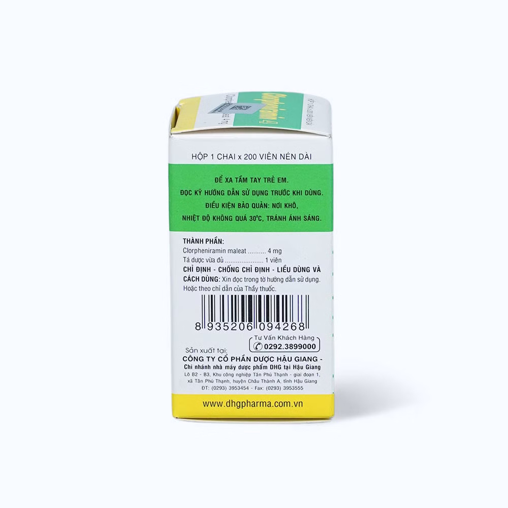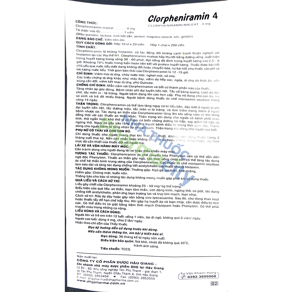 Clorpheniramin 4 mg là thuốc kháng histamin được sử dụng để điều trị các triệu chứng dị ứng như viêm mũi dị ứng, nổi mề đay, và các triệu chứng dị ứng khác. Thuốc có tác dụng giảm ngứa, sưng, và các triệu chứng khó chịu khác do dị ứng gây ra.
