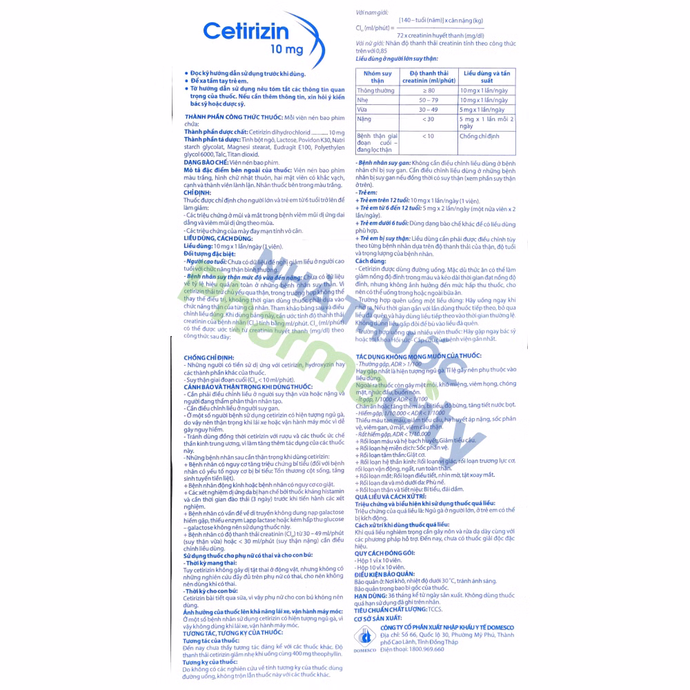 - Dược chất: Cetirizin dihydrochlorid 10 mg