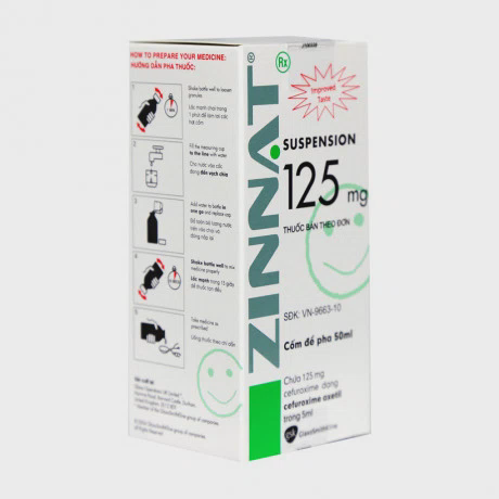 ZINNAT gói chứa 125mg cốm cefuroxime (dạng cefuroxime axetil) để dùng liều đơn sau khi pha