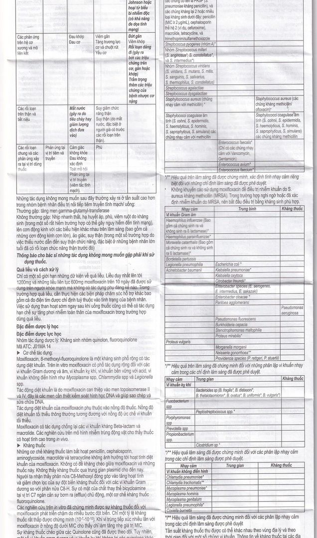Các tác dụng ngoại ý (ADR) dựa trên các nghiên cứu lâm sàng với moxifloxacin 400mg (chỉ dùng uống và nối tiếp [IV/uống]/tiêm tĩnh mạch) sắp xếp theo CIOMS về các loại thường gặp (tổng quát n = 17.951 trường hợp trong đó có 4.583 trường hợp dùng nghiên cứu trị liệu nối tiếp hoặc tiêm tĩnh mạch, tại thời điểm tháng 5/2010) được liệt kê như sau: Các tác dụng không mong muốn ở mức “thường gặp” được quan sát với tần suất < 3% không kể triệu chứng nôn và tiêu chảy.