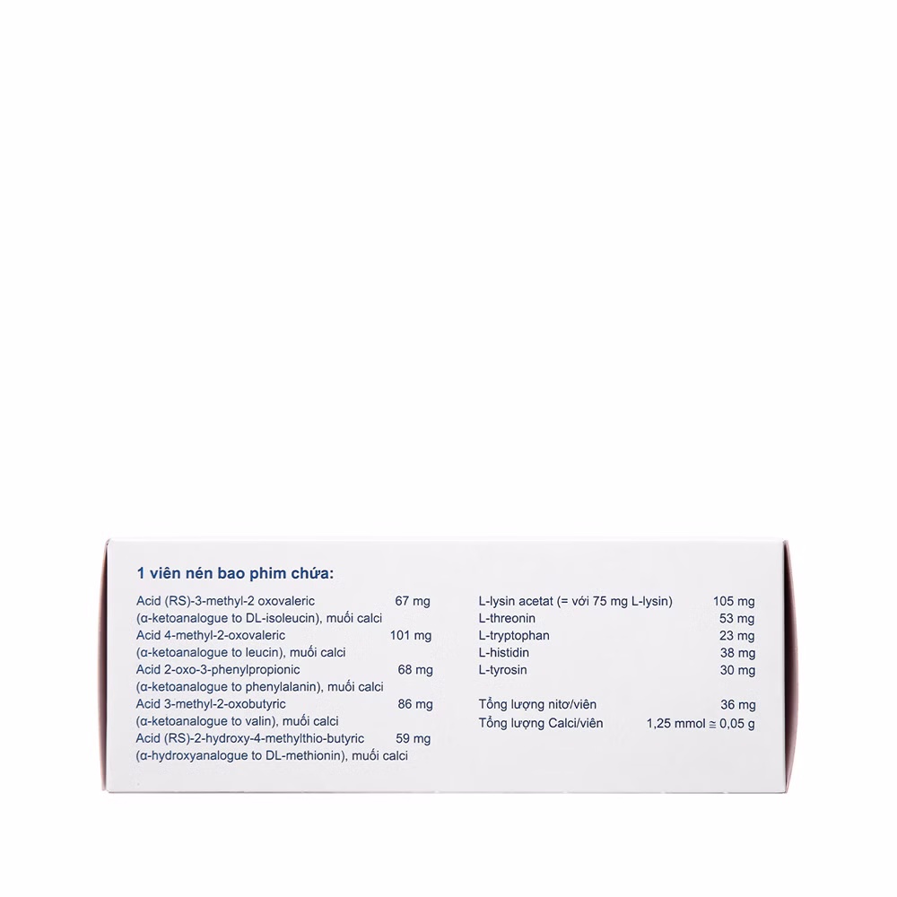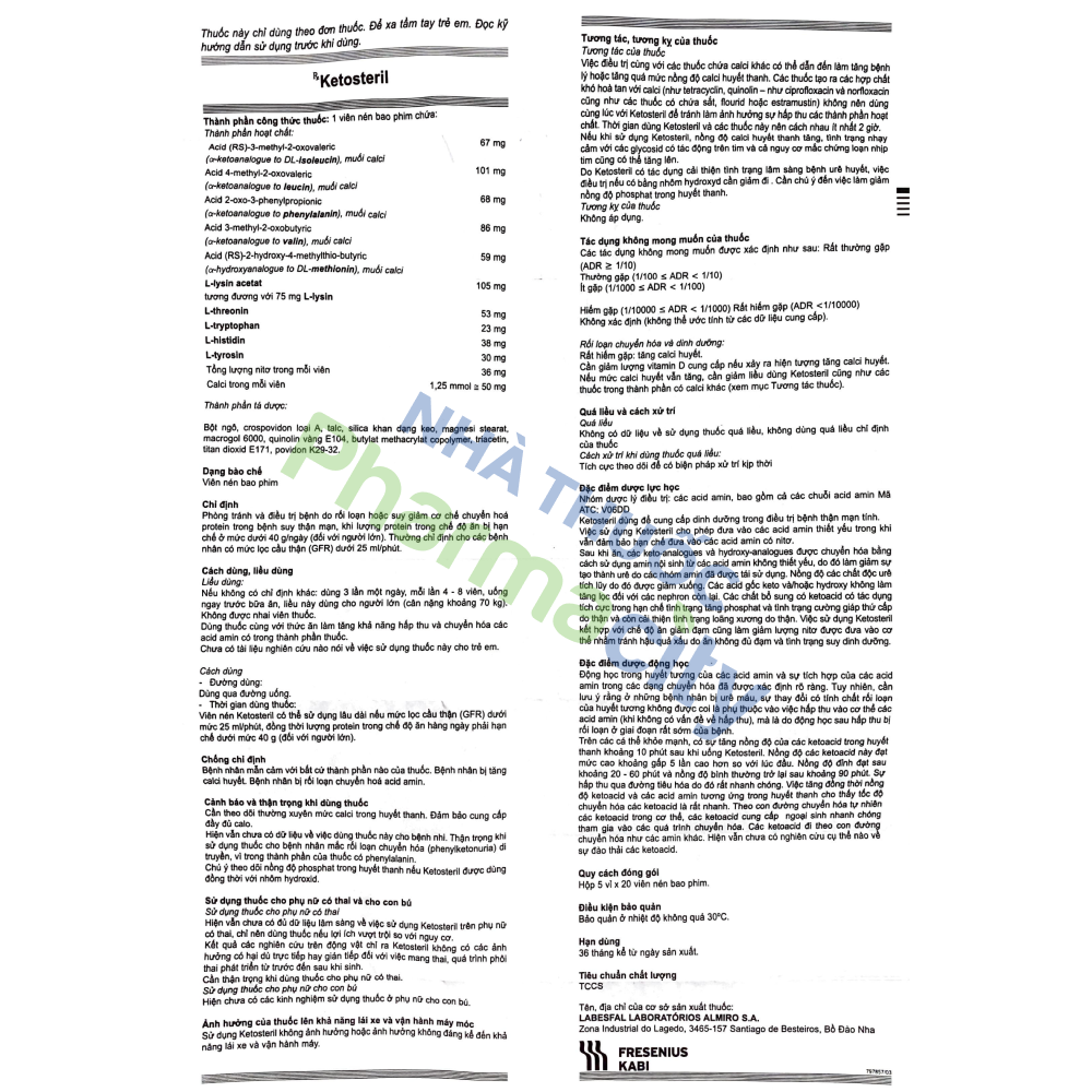 Ketosteril của Công ty Labesfal Laboratórios Almiro S.A. Thuốc được sử dụng để phòng ngừa và điều trị bệnh do rối loạn hoặc suy giảm cơ chế chuyển hoá protein trong bệnh suy thận mạn, khi lượng protein trong chế độ ăn bị hạn chế ở mức dưới 40 g/ngày (đối với người lớn). Thường chỉ định cho các bệnh nhân có mức lọc cầu thận (GFR) dưới 25 ml/phút. Thuốc được bào chế dưới dạng viên nén bao phim.