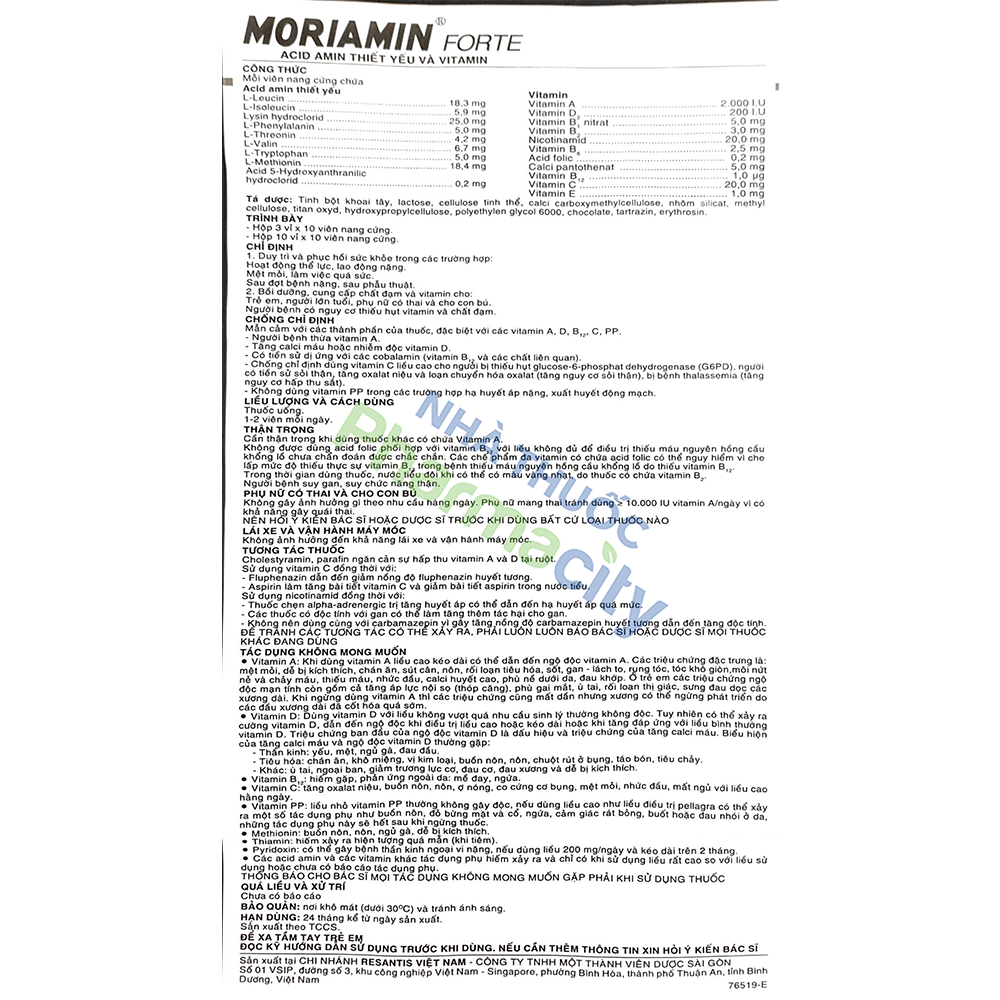 + Acid amin thiết yếu: L-Leucin 18,3mg, L-Isoleucin 5,9mg, Lysin hydroclorid 25,0mg, L-Phenylalanin 5,0mg, L-Threonin 4,2mg, L-Valin 6,7mg, L-Tryptophan 5,0mg, L-Methionin 18,4mg, Acid 5-Hydroxyanthranilic Hydroclorid 0,2mg.