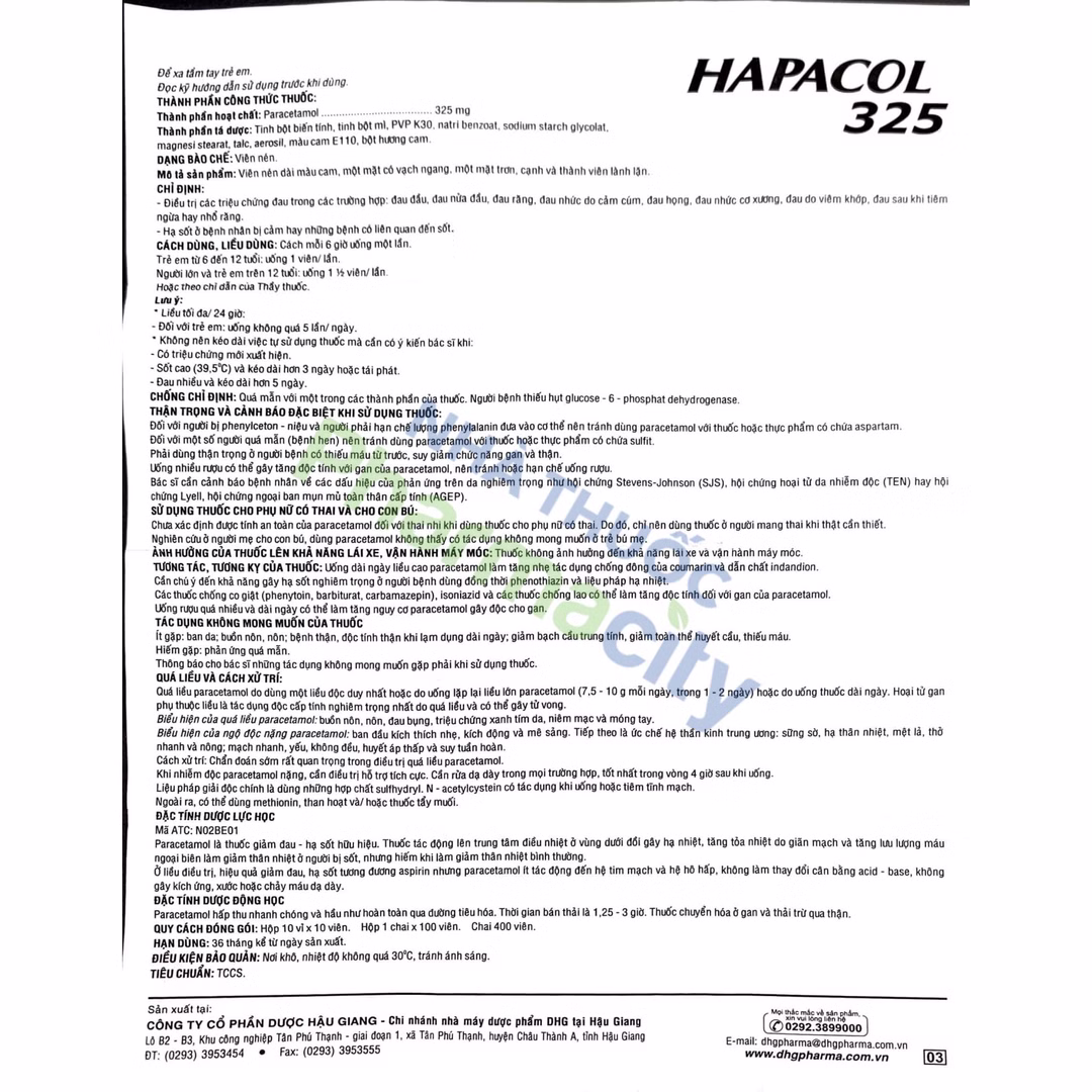 - Hapacol 325 của Công ty Cổ phần Dược Hậu Giang, thành phần chính là Paracetamol, là thuốc giảm đau – hạ sốt hữu hiệu.