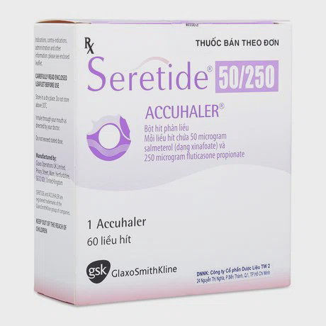 Seretide accuhaler 50/250được sản xuất bởiGlaxoSmithKline LLC, thành phần chứa salmeterol (dạng salmeterol xinafoate) và fluticasone propionate, là thuốc dùng điều trị bệnh hen, bệnh phổi tắc nghẽn mạn tính.