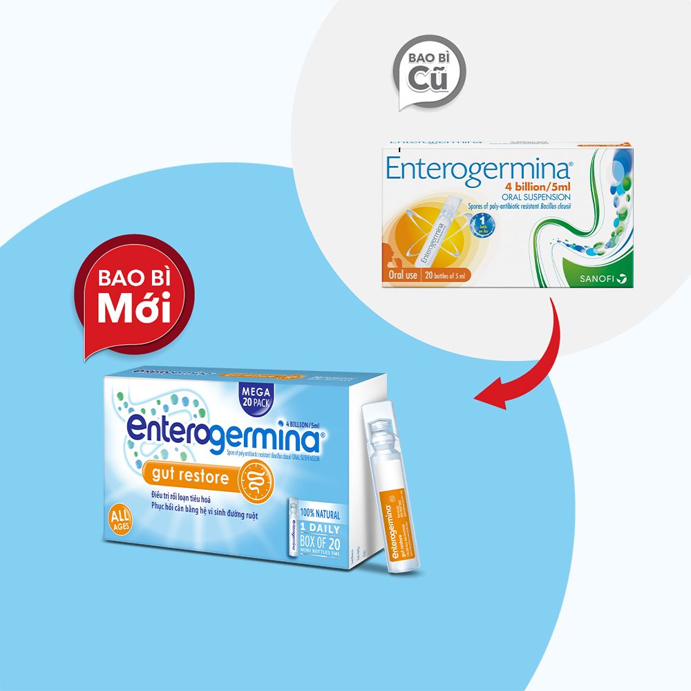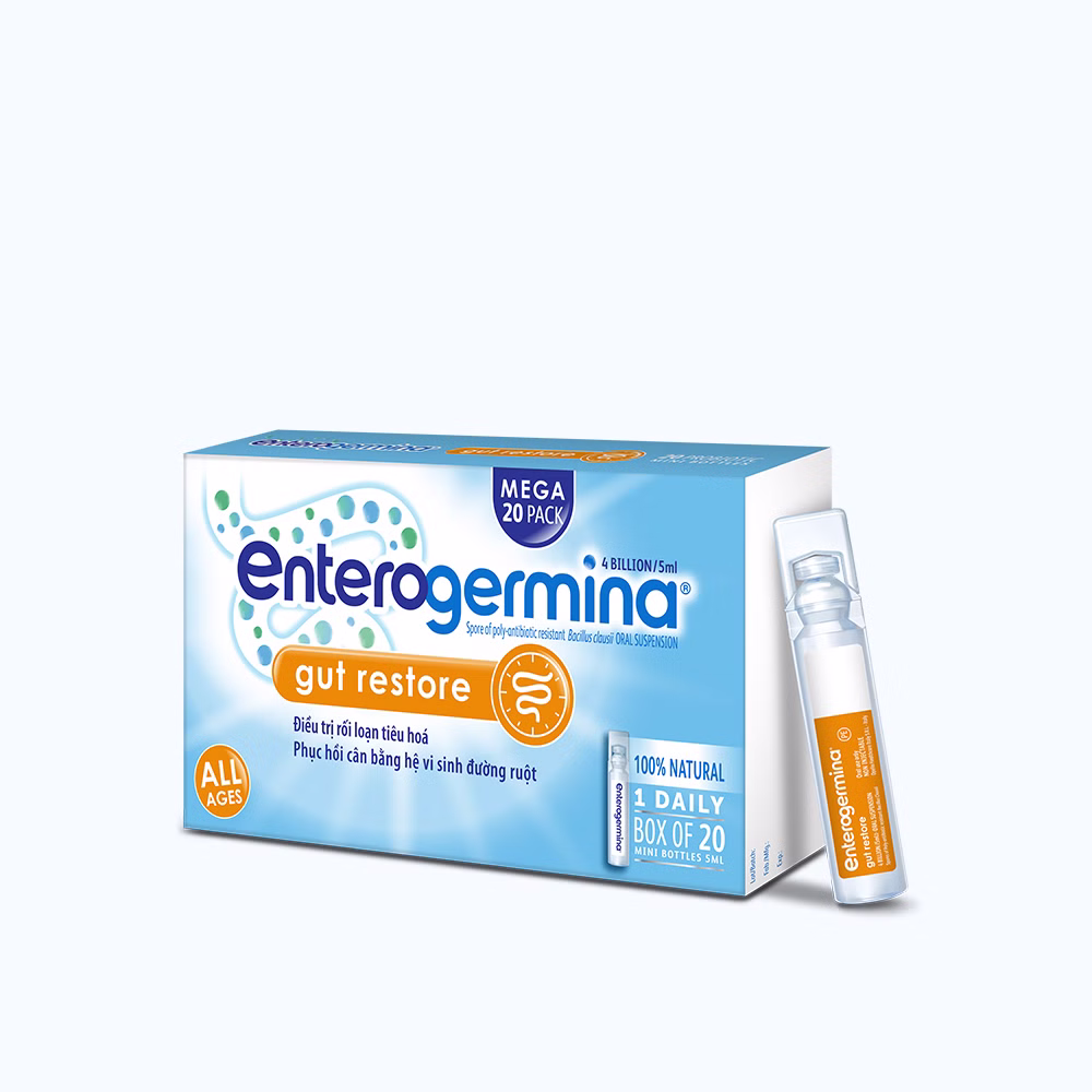 Enterogermina là một sản phẩm bổ sung lợi khuẩn dưới dạng hỗn dịch uống, được dùng để trị và phòng ngừa rối loạn vi khuẩn đường ruột. Mỗi ống chứa 5ml hỗn dịch và tổng cộng có 2 vỉ, mỗi vỉ chứa 10 ống. Sản phẩm giúp cân bằng hệ vi khuẩn đường ruột và hỗ trợ tiêu hóa.