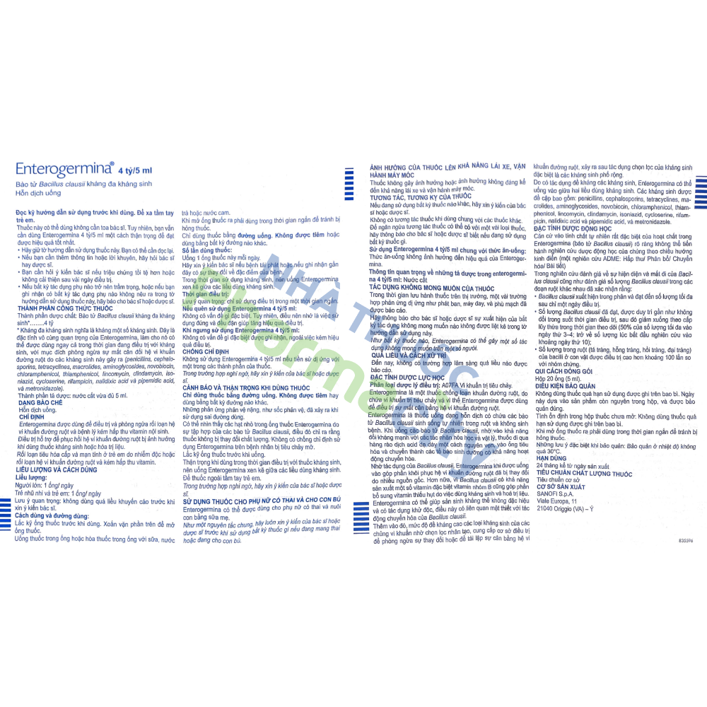 Có thể nhìn thấy – các hạt nhỏ trong ống thuốc Enterogermina 4B do sự tập hợp của các bào tửBacillus clausii, điều đó chỉ ra rằng thuốc không bị thay đổi chất lượng. Không có chống chỉ định sử dụng Enterogermina 4B trên bệnh nhân bị tiêu chảy mỡ.