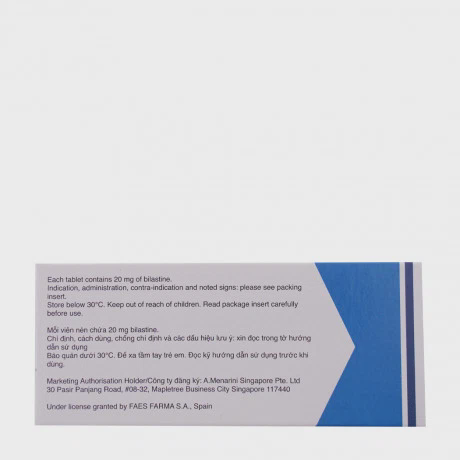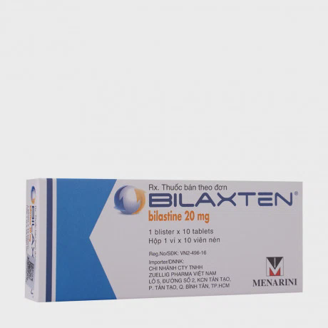 Là một loại thuốc chống dị ứng thuộc nhóm kháng histamine thế hệ mới. Thành phần chính của Bilaxten là bilastine, một chất ức chế chọn lọc histamine H1, giúp giảm các triệu chứng dị ứng như hắt hơi, ngứa mũi, chảy nước mũi, và ngứa mắt. Thuốc thường được chỉ định để điều trị các triệu chứng của viêm mũi dị ứng và mày đay. Viên nén Bilaxten 20mg được thiết kế để cung cấp hiệu quả lâu dài với liều lượng một lần mỗi ngày, giúp kiểm soát các triệu chứng dị ứng một cách hiệu quả và tiện lợi.