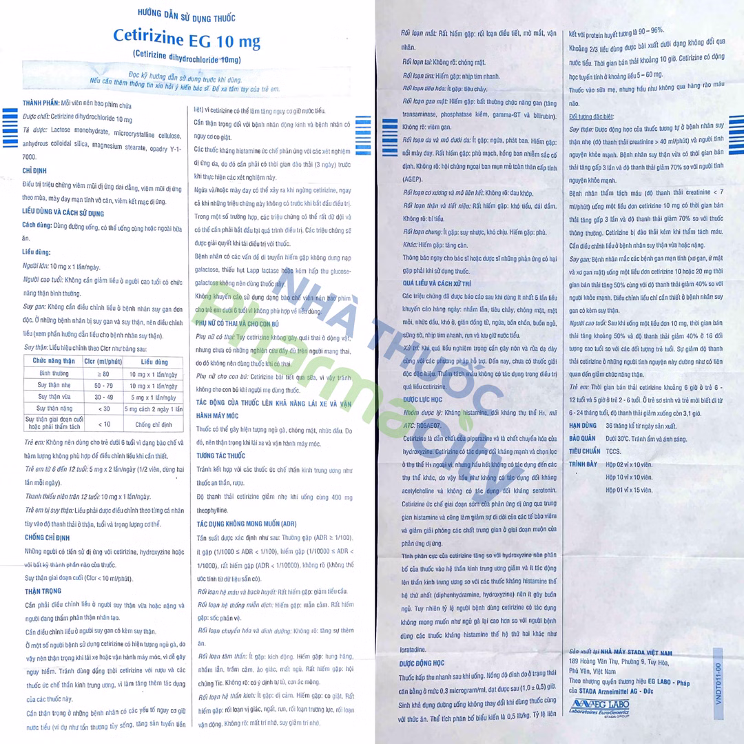 Viên nén Cetirizin EG 10mgchứa hoạt chất Cetirizine dihydrochloride, một loại thuốc kháng histamine được sử dụng để điều trị triệu chứng viêm mũi dị ứng (như hắt hơi, chảy nước mũi, ngứa mũi) và mày đay (phát ban, ngứa). Cetirizine hoạt động bằng cách ngăn chặn tác động của histamine, một chất gây ra các triệu chứng dị ứng trong cơ thể. Viên nén Cetirizin EG 10mg giúp giảm nhanh các triệu chứng khó chịu do dị ứng gây ra, mang lại hiệu quả kéo dài và ít gây buồn ngủ. Sản phẩm được sử dụng một lần mỗi ngày và phù hợp cho người lớn và trẻ em từ 6 tuổi trở lên.