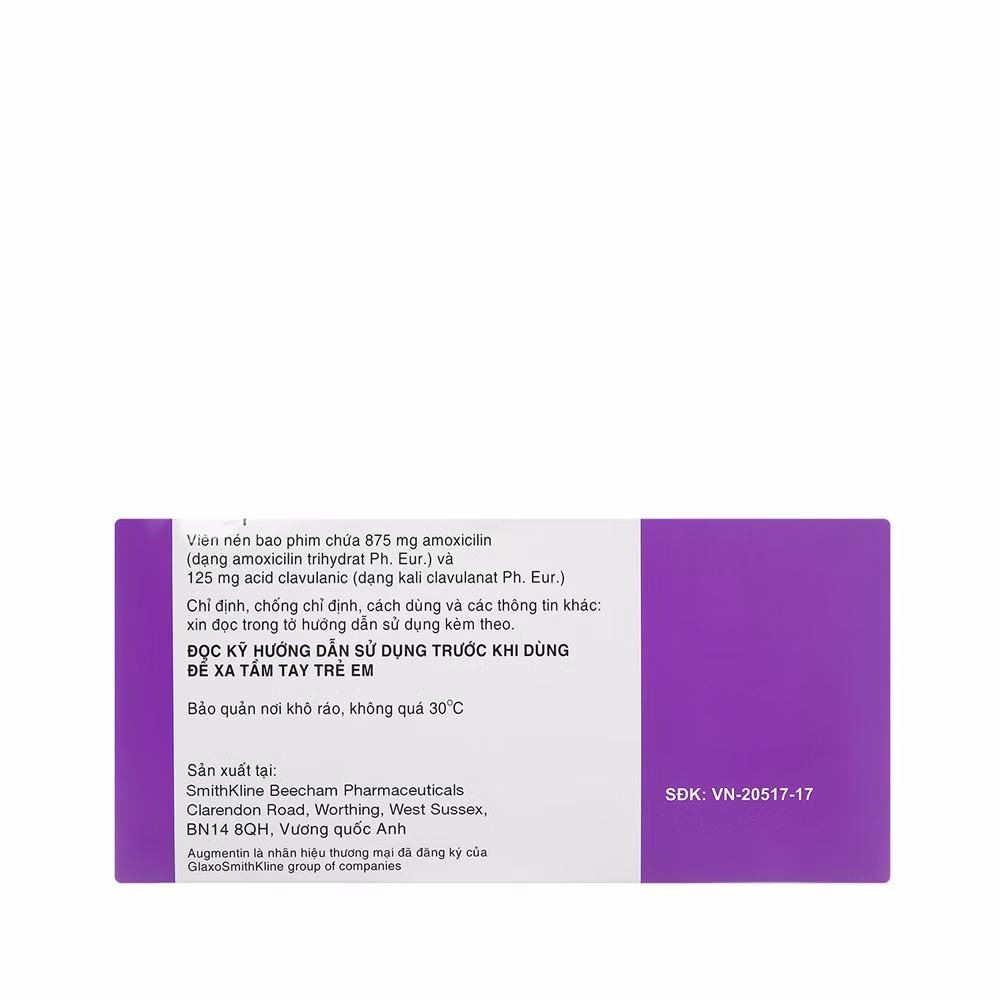 - Hoạt chất: 875 mg amoxicilin (dưới dạng amoxicilin trihydrat) và 125 mg acid clavulanic (dạng kali clavulanat).