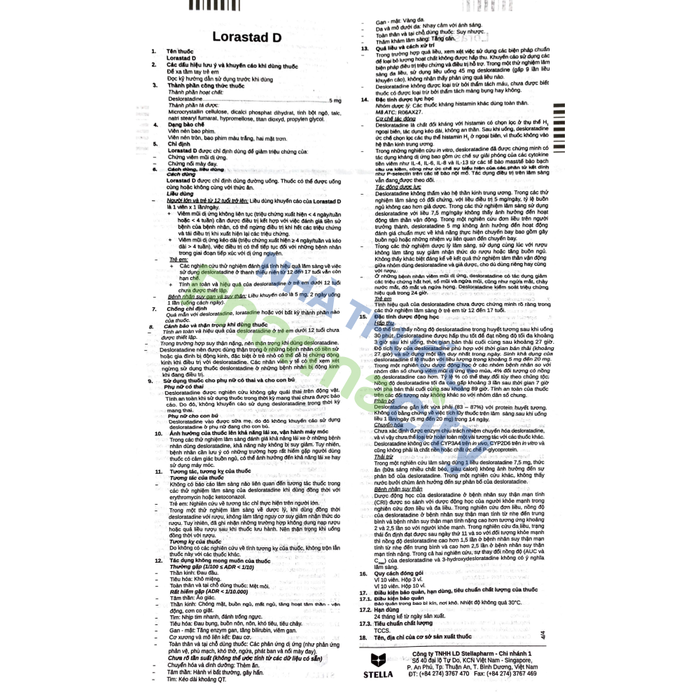 Viên nén Lorastad D Stella 5mg điều trị triệu chứng viêm mũi dị ứng, mày đay (3 vỉ x 10 viên)