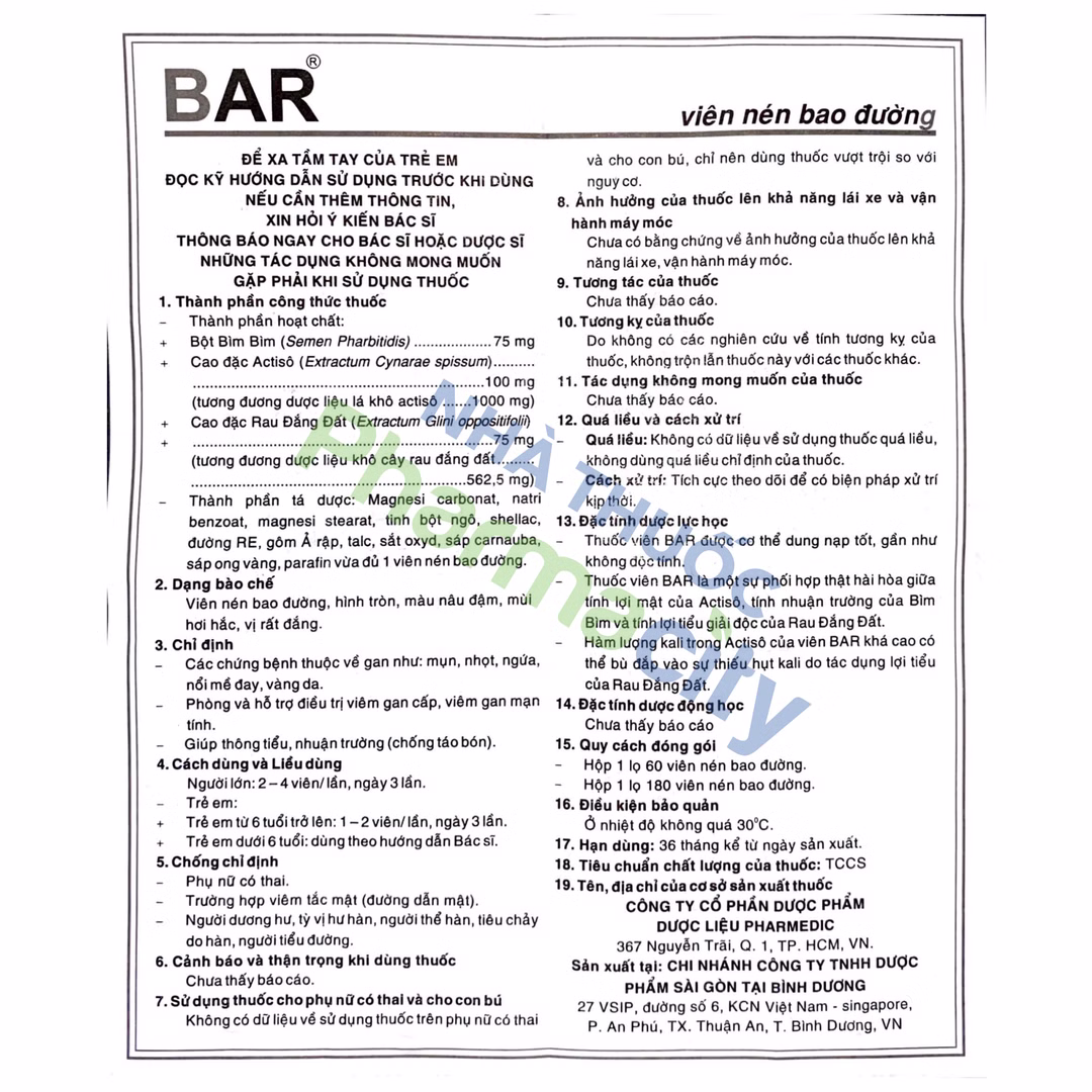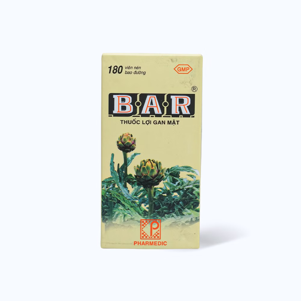 Thuốc BAR 180 viên của Công ty Cổ phần Dược phẩm Dược liệu PHARMEDIC, chứa bột Bìm Bìm, cao đặc Actiso, cao đặc Rau Đắng Đất có tác dụng phòng, hỗ trợ và điều trị các bệnh về gan, giúp thông tiểu, nhuận trường. Thuốc BAR được bào chế dưới dạng viên nén bao đường. Viên nén bao đường, hình tròn, màu nâu đậm, mùi hơi hắc, vị rất đắng. Hộp 1 lọ 180 viên.