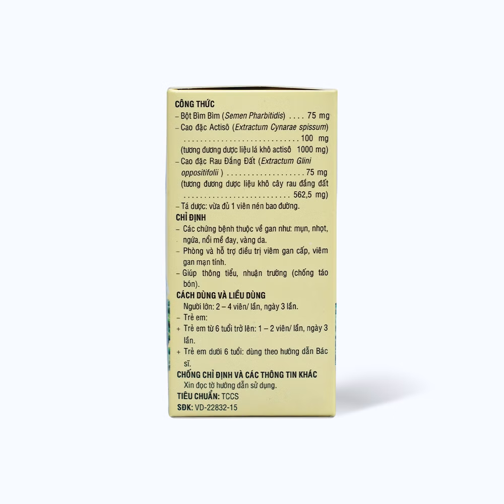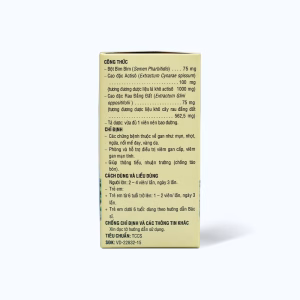 - Bột Bìm Bìm (Semen Pharbitidis) 75mg, Cao đặc Actisô (Extractum Cynarae spissum) 100mg (tương đương dược liệu lá khô actisô 1000mg), Cao đặc Rau Đắng Đất (Extractum Glini oppositifolii) 75mg ( tương đương dược liệu khô cây rau đắng đất 562,5mg).