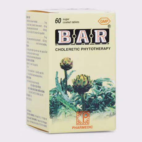 Viên nén bao đường BAR của Công ty cổ phần dược phẩm dược liệu Pharmedic, chứa bột Bìm Bìm, cao đặc Actiso, cao đặc Rau Đắng Đất có tác dụng phòng, hỗ trợ và điều trị các bệnh về gan, giúp thông tiểu, nhuận trường.