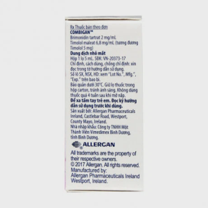 Thuốc nhỏ mắt Combigan 5ml là sản phẩm của công ty Allergan Pharmaceuticals Ireland, chứa hoạt chất chính là brimonidin tartrat 2,0 mg và timolol maleat 6,8 mg (tương đương với 5 mg timolol). Thuốc được chỉ định trong điều trị giảm áp suất nội nhãn (IOP) ở những bệnh nhân bị glaucoma góc mở mạn tính hoặc tăng nhãn áp đáp ứng không đầy đủ với các thuốc chẹn beta dùng tại chỗ.