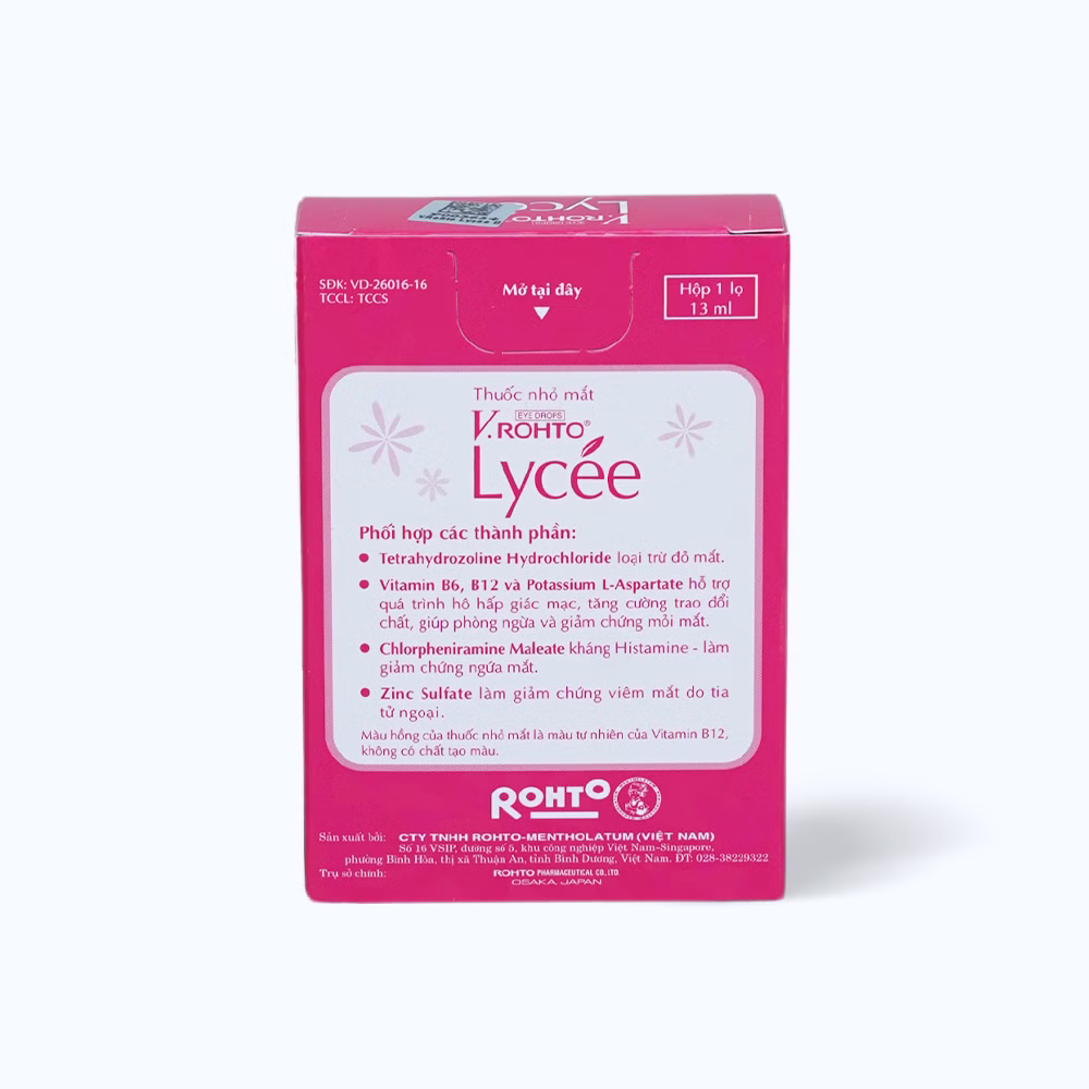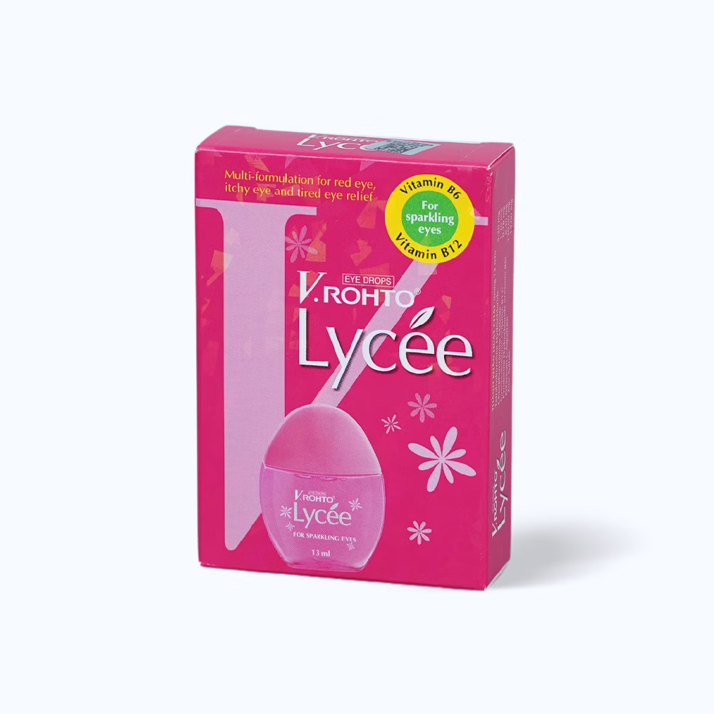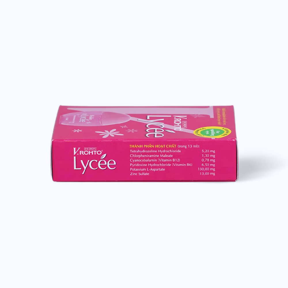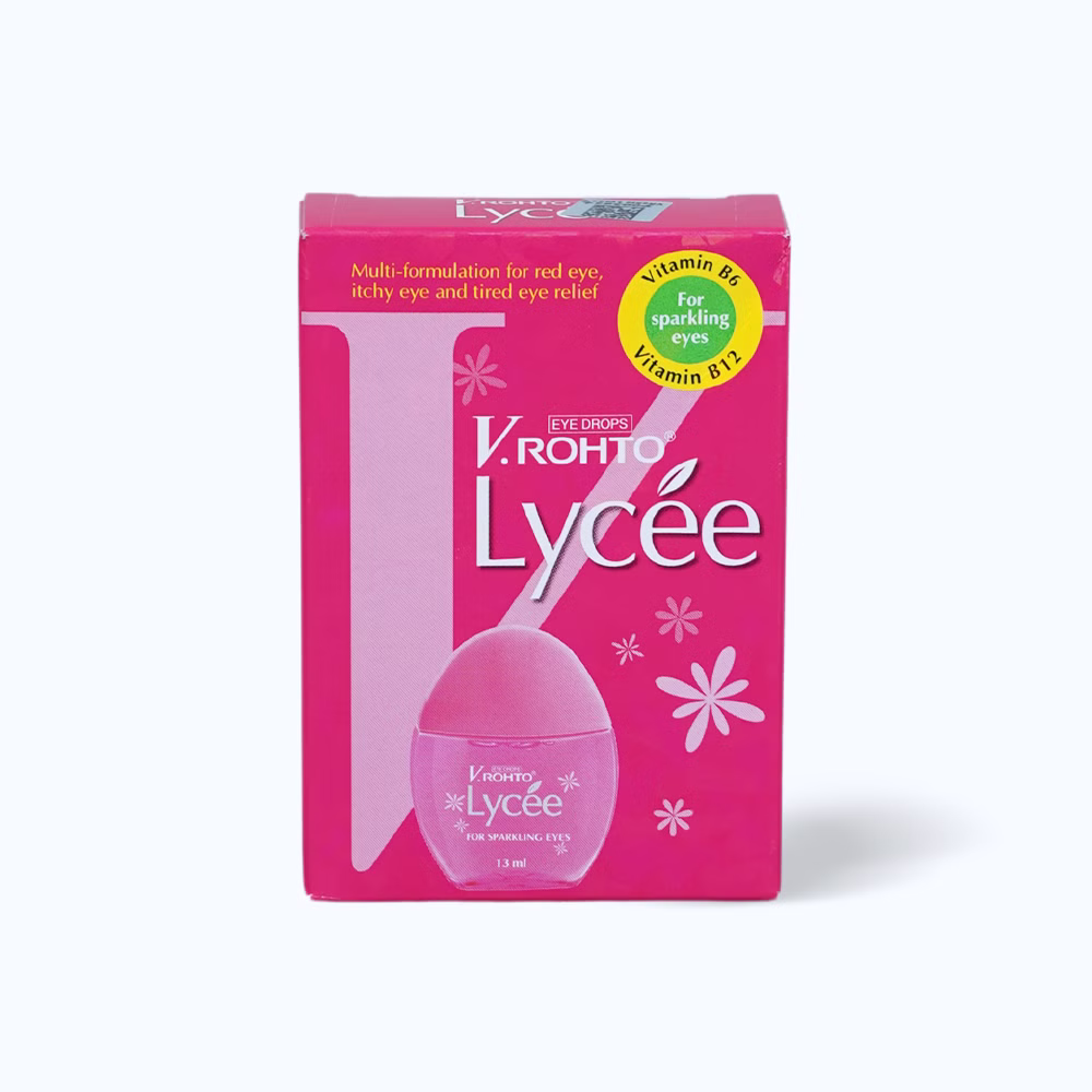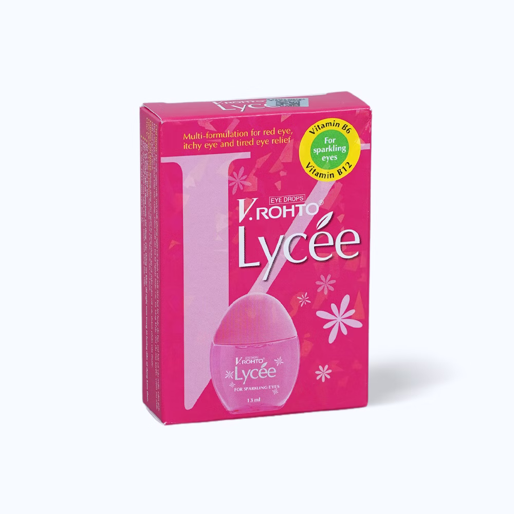 VRohto Lycee Drop (Lo13ml) là sản phẩm củaCông ty TNHH Rohto-Mentholatum (Việt Nam); thuốc chứa các hoạt chất chính: Potassium L-Aspartate, Zinc sulfate, Pyridoxine hydrochloride (Vitamin B6), Tetryzoline hydrochloride, Chlorpheniramine maleate, Cyanocobalamin (Vitamin B12); thuốc dùng cho các trường hợp: Đỏ mắt, ngứa mắt, mỏi mắt; phòng ngừa các bệnh về mắt (khi bơi lội hoặc do bụi, mồ hôi rơi vào mắt), cảm giác khó chịu khi đeo kính tiếp xúc cứng, viêm mắt do tia tử ngoại hoặc các tia sáng khác (như mù tuyết), viêm mí mắt, mắt mờ do tiết dịch.