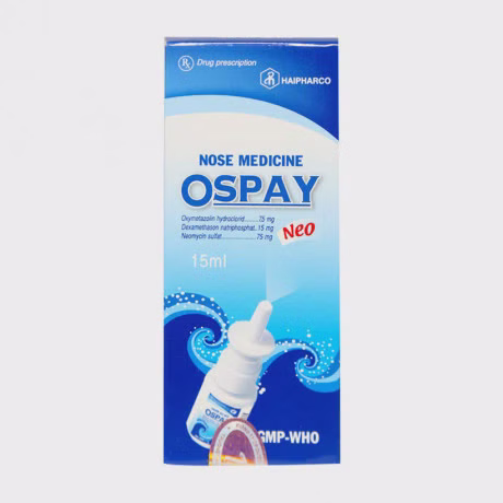 Thuốc xịt mũi Ospay Hải Phòng 15ml có thành phần chính là Dexamethason Natriphosphat và Oxymetazolin HCl được sản xuất bởi Công ty Cổ phần Dược phẩm Hải Phòng. Ospay giúp làm giảm tạm thời sung huyết mũi do cảm lạnh, viêm mũi, viêm xoang, sốt cỏ khô hoặc dị ứng đường hô hấp trên, giảm sung huyết ở xoang.