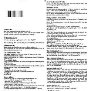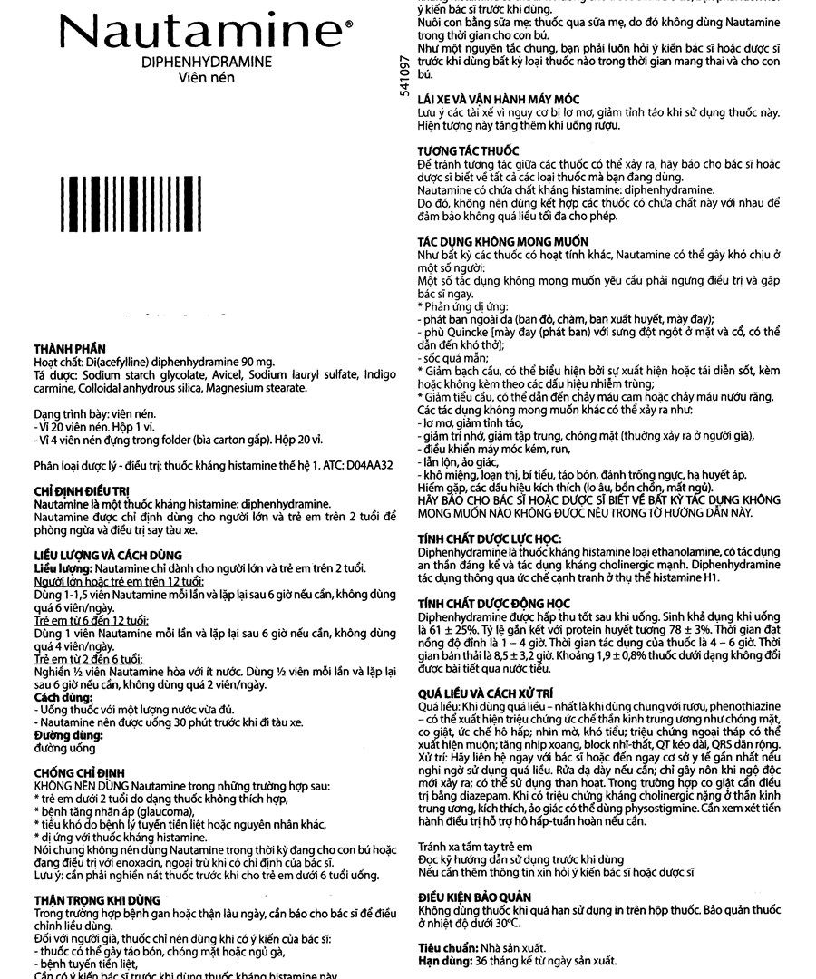 Viên nén Nautamine 90mglà một loại thuốc có thành phần hoạt chất chính là diphenhydramine. Đây là một loại thuốc được sử dụng để điều trị và ngăn ngừa say tàu xe. Diphenhydramine là một loại thuốc kháng histamin có tác dụng làm giảm cảm giác buồn nôn và nôn mửa do rối loạn vận động.