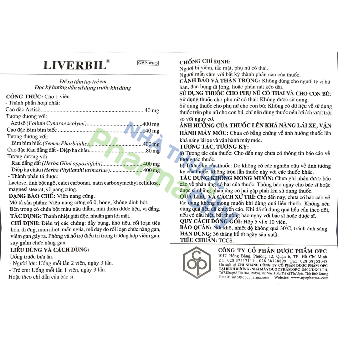 Liverbil® là chế phẩm được bào chế từ các dược liệu actisô, bìm bìm biếc, rau đắng đất và diệp hạ châu có tác dụng tăng tiết mật, lợi tiểu, thanh nhiệt, giải độc, bảo vệ gan. Trong đó: