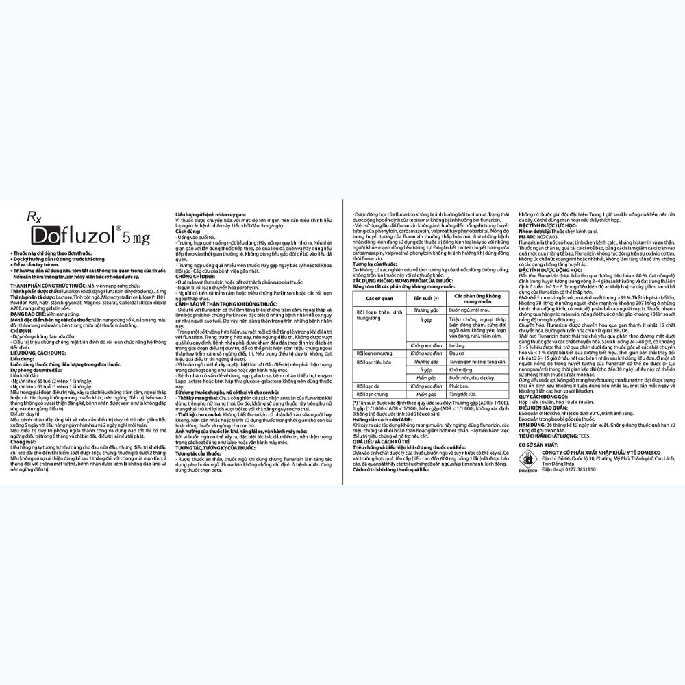 Dofluzol 5 mg được sản xuất bởi Công ty Cổ phần Xuất nhập khẩu Y tế Domesco, với thành phần chính Flunarizine, là thuốc dùng để dự phòng chứng đau nửa đầu và điều trị triệu chứng chóng mặt do rối loạn chức năng hệ thống tiền đình.