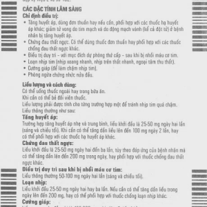 – Chứng đau thắt ngực: Liều khởi đầu 25 – 50mg/2 – 3 lần/ngày tùy đáp ứng có thể tăng đến 200mg, hay phối hợp với các thuốc chống đau thắt cơ ngực.
