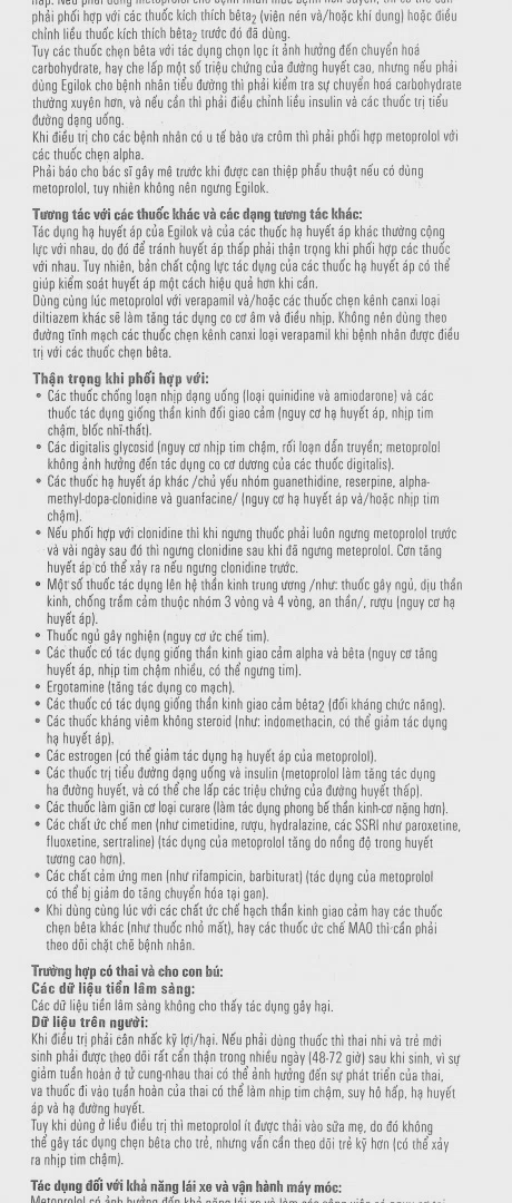 – Egilok và các thuốc hạ huyết áp thường cộng lực với nhau, để tránh huyết áp thấp, nên thận trọng khi dùng chung.