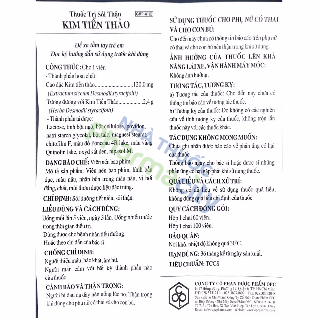 Tá dược (lactose, tinh bột ngô, bột cellulose, tinh bột glycolat natri, povidon magnesi stearat, bột talc, đường trắng, màu nâu HT, sáp ong vàng) vđ 1 viên. - Cho viên bao phim: Cao đặc Kim tiền thảo 120mg tương ứng với Kim tiền thảo 2,4g