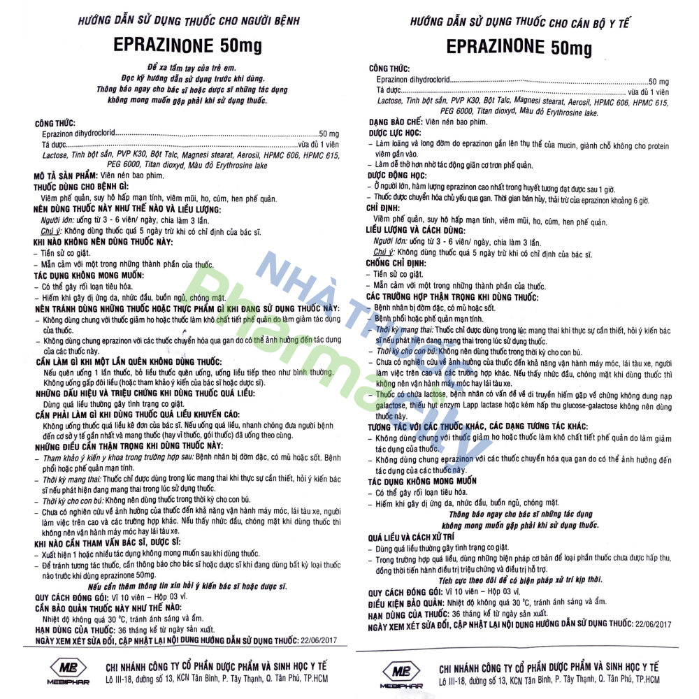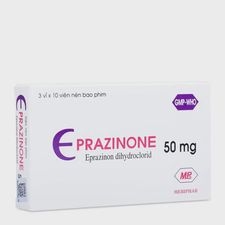 Eprazinone 50mg, sản phẩm của Công ty CP Dược phẩm và Sinh học Y tế (Mebiphar Việt Nam), là thuốc hỗ trợ tiêu nhầy, loãng đàm và giảm ho hiệu quả. Thuốc chứa hoạt chất chính là Eprazinon dihydroclorid, được sử dụng trong điều trị nhiều vấn đề hô hấp như viêm phế quản, suy hô hấp mãn tính, viêm mũi, ho, cúm và hen phế quản.