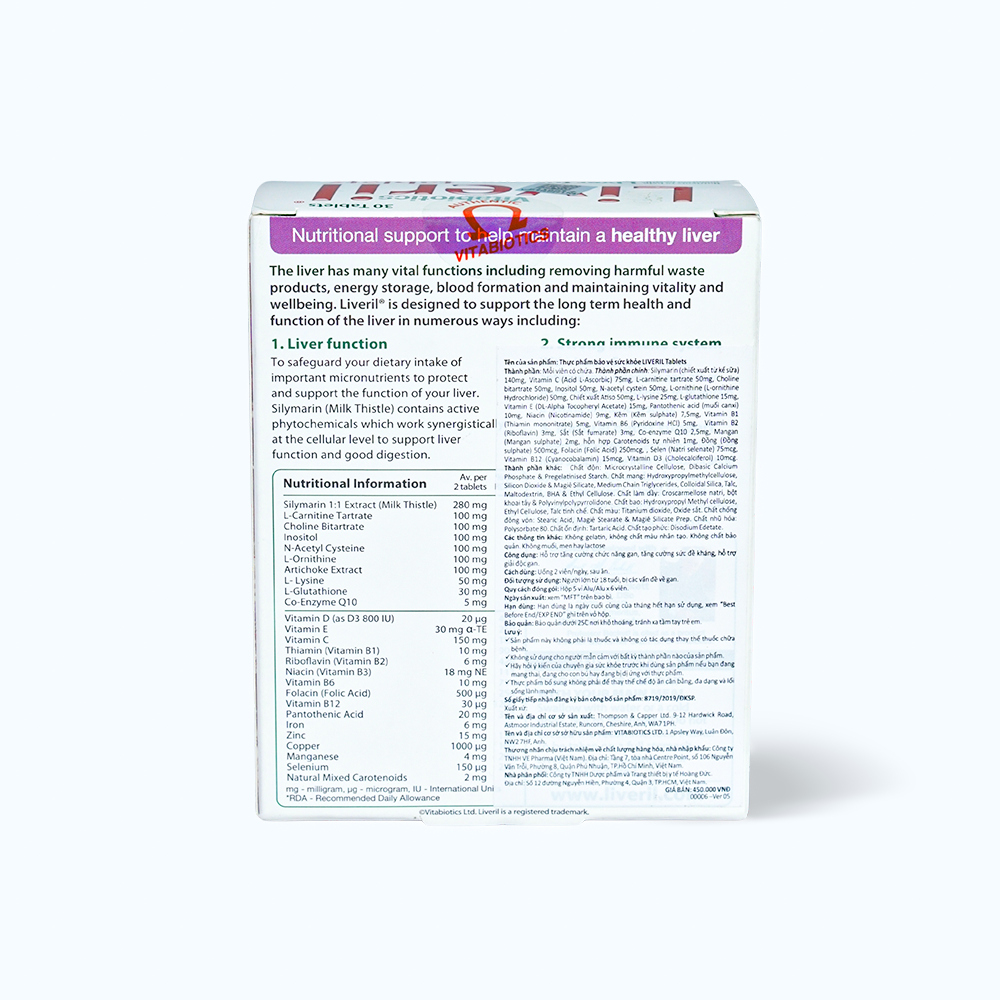 Silymarin (chiết xuất từ kế sữa) mg, Vitamin C (Acid L-Ascorbic) 75mg, L-carnitine tartrate 50mg, Choline bitartrate 50mg, Inositol 50mg, N-acetyl cystein 50mg, L-ornithine (L-ornithine Hydrochloride) 50mg, chiết xuất atiso 50mg, L-lysine 25mg, L-glutathione 15mg, Vitamin E (DL-Alpha Tocopheryl Acetate) 15mg, Axit pantothenic (muối canxi) 10mg, Niacin (Nicotinamide) 9mg, Kēm (Kēm sulphat) 7.5mg, Vitamin B1 (Thiamin mononitrate) 5mg, Vitamin B6 (Pyridoxine HCI) 5mg, Vitamin B2 (Riboflavin) 3mg, Sắt (Sắt fumarate) 3mg, Co-enzym Q10 2.5mg, Mangan (Mangan sulphat) 2mg, hỗn hợp carotenoid tự nhiên 1mg, Đồng (Đồng sulphat) 500μg, Folacin (Axit folic) 250μg, Selen (Natri selenat) 75μg, Vitamin B12 (Cyanocobalamin) 15μg, Vitamin D3 (Cholecalciferol) 10μg.