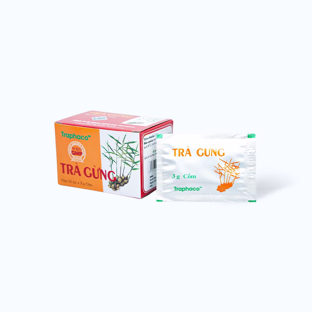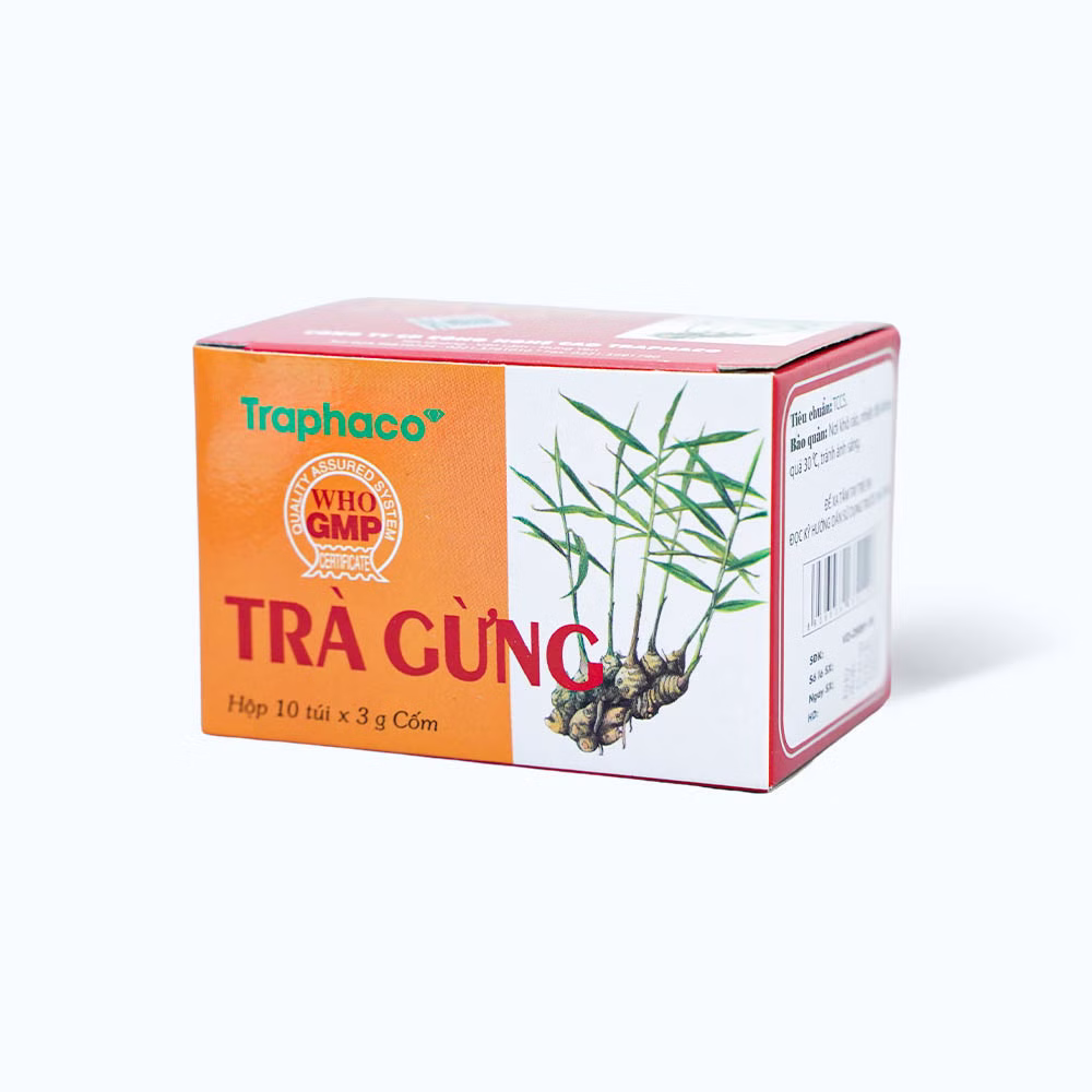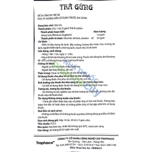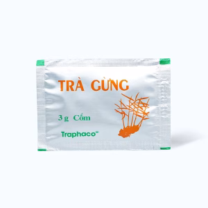 Trà gừng Traphaco là sản phẩm của công ty Cổ phần Công nghệ cao Traphaco, thành phần chính chứa gừng tươi. Sản phẩm giúp ôn trung, trục hàn, hồi dương, thông mạch dùng trị đau bụng do lạnh, đầy chướng không tiêu hoặc nôn, tiêu lỏng do lạnh, người nhiễm lạnh, chân tay lạnh, mạch nhỏ, ho do lạnh.