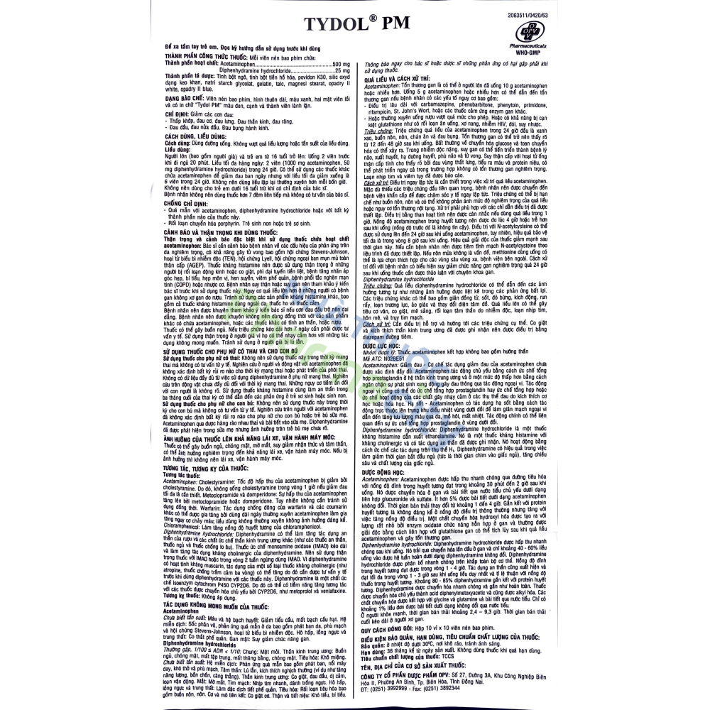 Viên nén Tydol PM là thuốc giảm đau và hỗ trợ giấc ngủ. Nó chứa Acetaminophen để giảm đau và Diphenhydramine để gây buồn ngủ. Thuốc giúp giảm đau nhẹ đến vừa và cải thiện giấc ngủ.