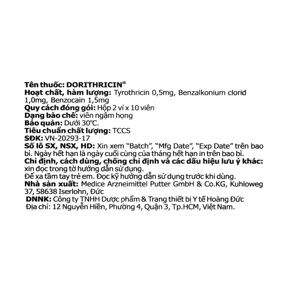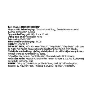 Viên ngậm Dorithricinlà một loại thuốc được sử dụng để điều trị viêm họng và các triệu chứng liên quan như đau họng và viêm nhiễm. Thuốc Dorithricin thường được sử dụng để làm giảm viêm và giảm đau, thường qua cơ chế làm giảm sự phát triển của vi khuẩn và vi rút gây bệnh.