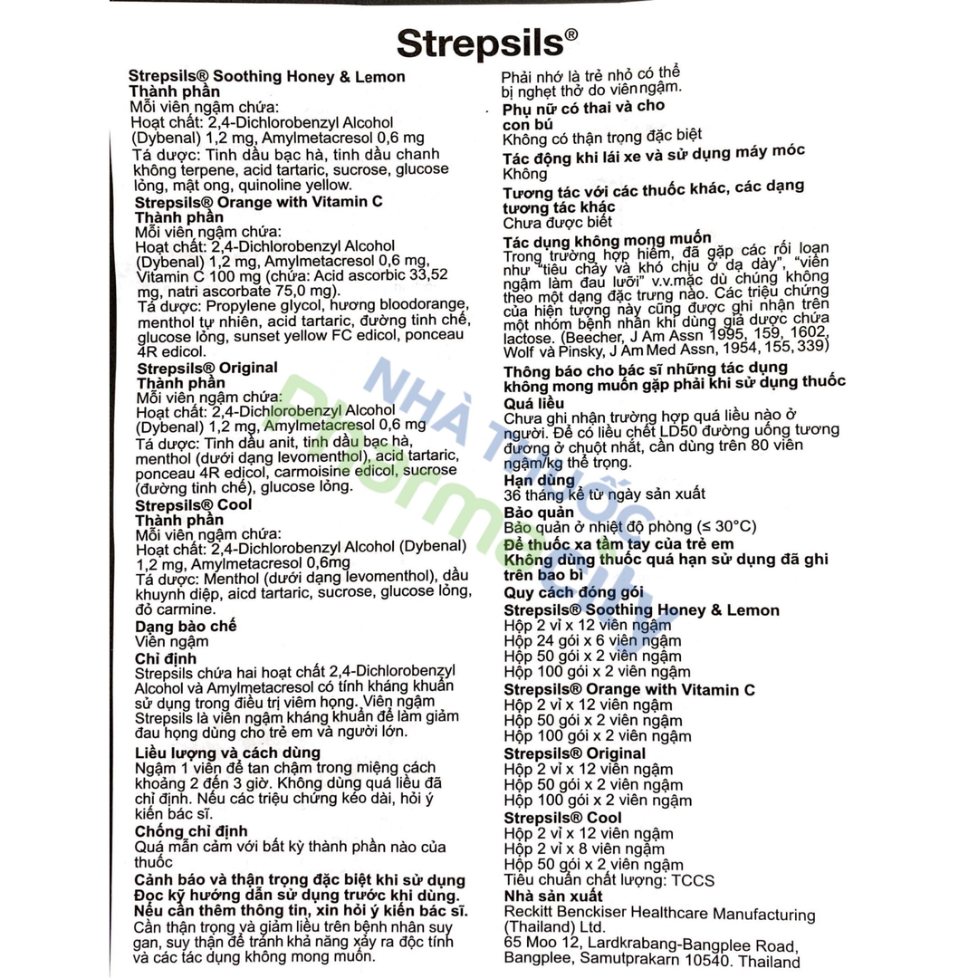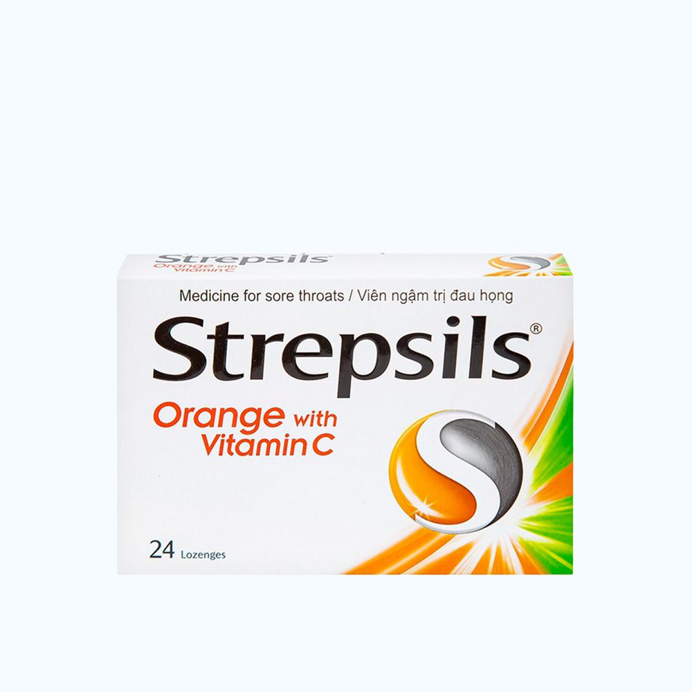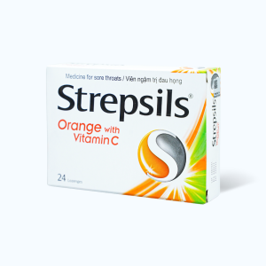 Thuốc Strepsils Orange With Vitamin C 24 viên chứa 2 hoạt chất là 2,4 – dichlorobenzyl alcohol (dybenal) và amylmetacresol có tính kháng khuẩn sử dụng trong điều trị viêm họng. Viên ngậm Strepsils cam là viên ngậm kháng khuẩn để làm giảm đau họng dùng cho trẻ em và người lớn.