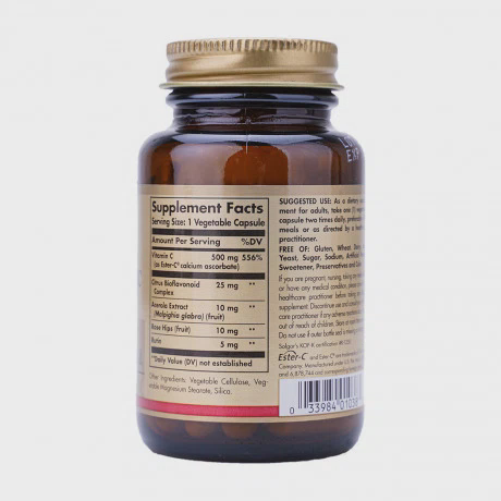 - Vitamin C (như Ester-C calcium ascorbate) 500mg, Hỗn hợp Citrus Bioflavonoid 25mg, Chiết xuất sơ ri (Malpighia glabra) (quả) 10mg, Tầm xuân (Rose Hips) (quả) 10mg, Rutin 5mg.