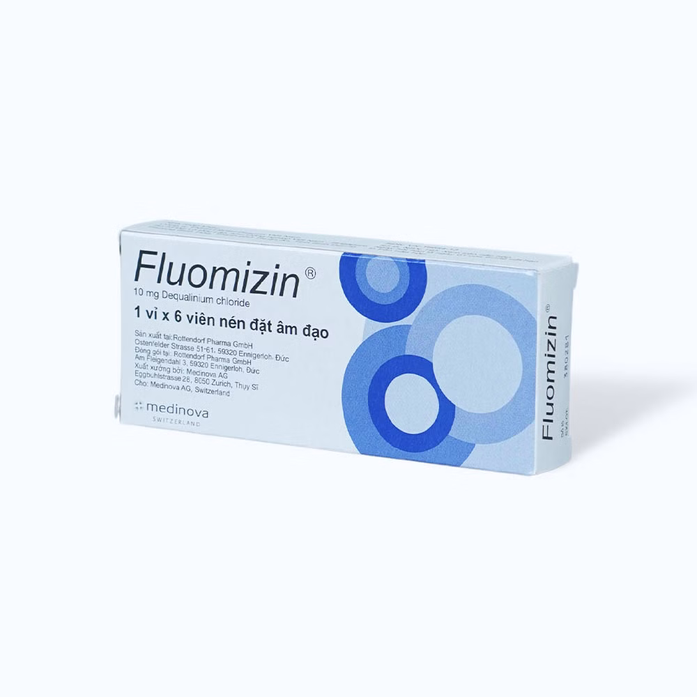 Fluomizin 10 mg 1×6 của Rottendorf Pharma GmbH, thành phần chính dequalinium chlorid, là thuốc được sử dụng để điều trị nhiễm nấm âm đạo, nhiễm khuẩn âm đạo (như bệnh âm đạo do vi khuẩn và bệnh nấm Candida); bệnh do Trichomonas, để đạt được sự vô khuẩn trước các phẫu thuật về phụ khoa và trước khi sinh.
