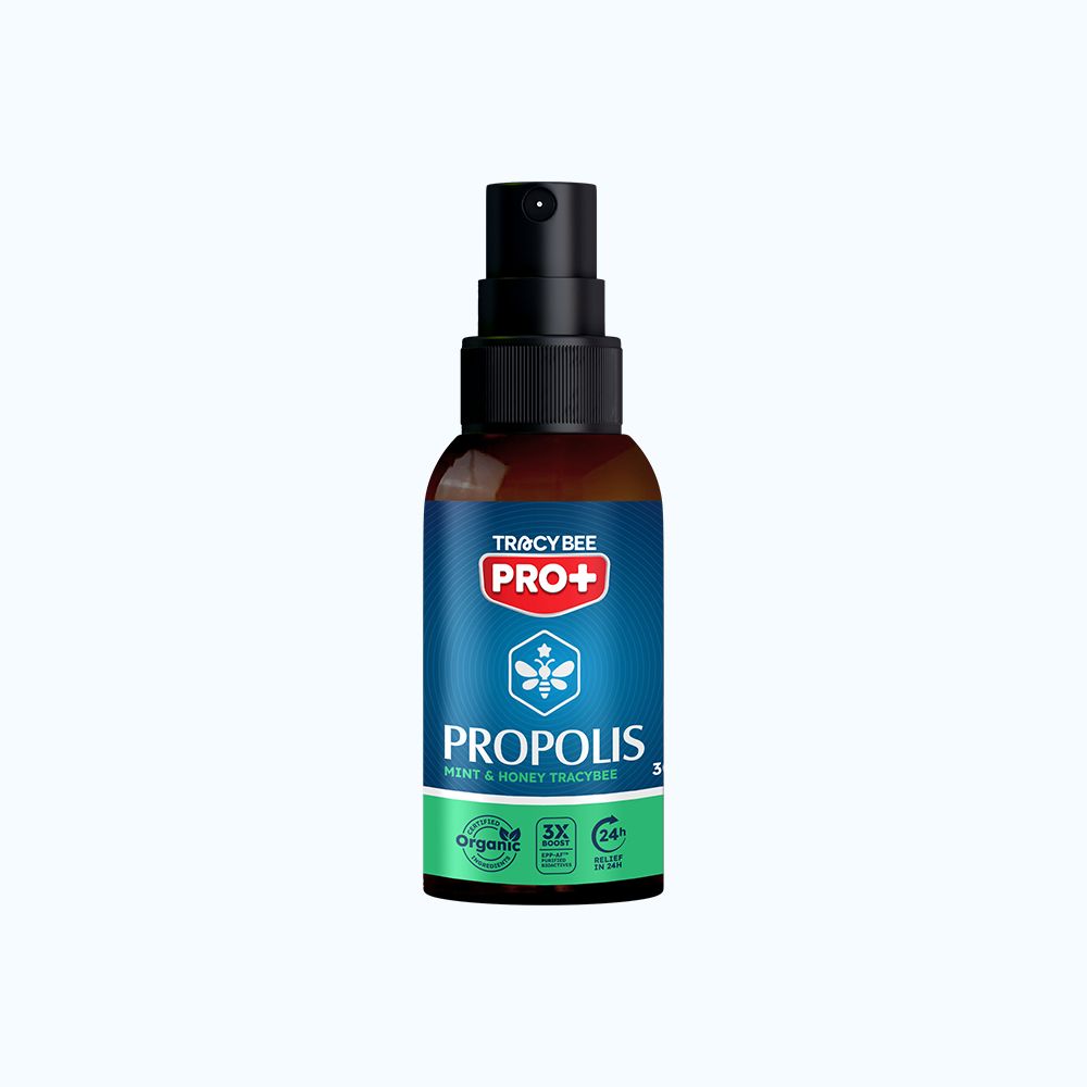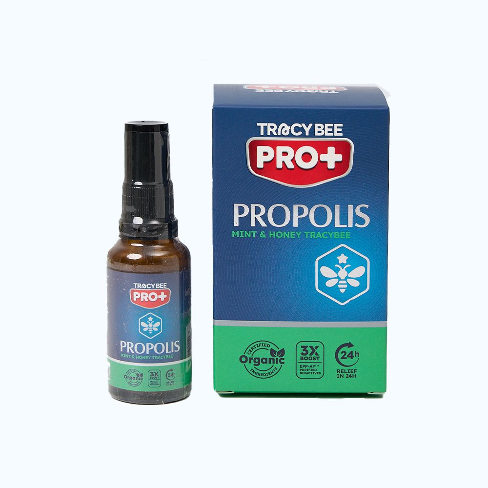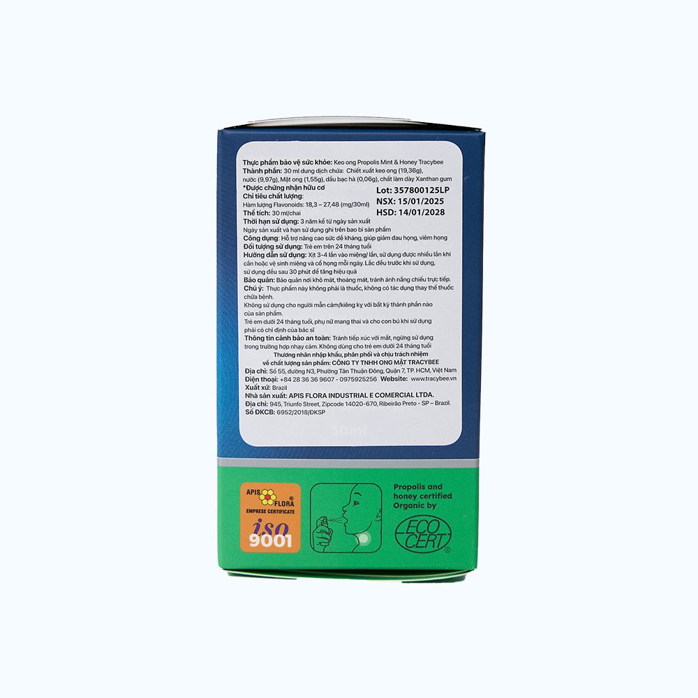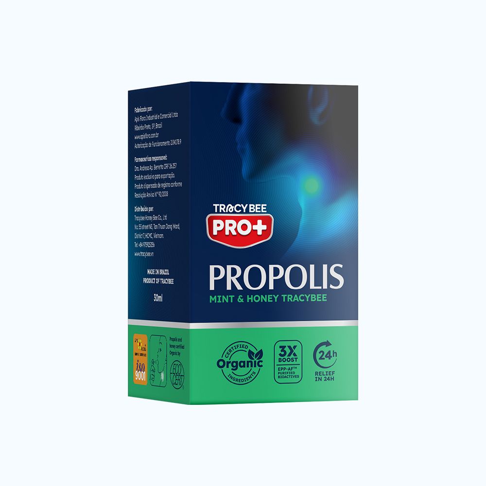 Xịt keo ong xanh vị bạc hà Tracybee được sản xuất bởi APIS FLORA INDUSTRIAL E COMERCIAL,LTDA. sản phẩm là thực phẩm chức năng hỗ trợ giảm ho kéo dài, giúp nâng cao sức đề kháng, bổ sung kháng thể tự nhiên của keo ong. Sản phẩm giúp hạn chế quá trình oxy hóa, kháng khuẩn trong khoang miệng và đường hô hấp, hỗ trợ làm giảm các triệu chứng viêm họng, ho, cảm cúm.
