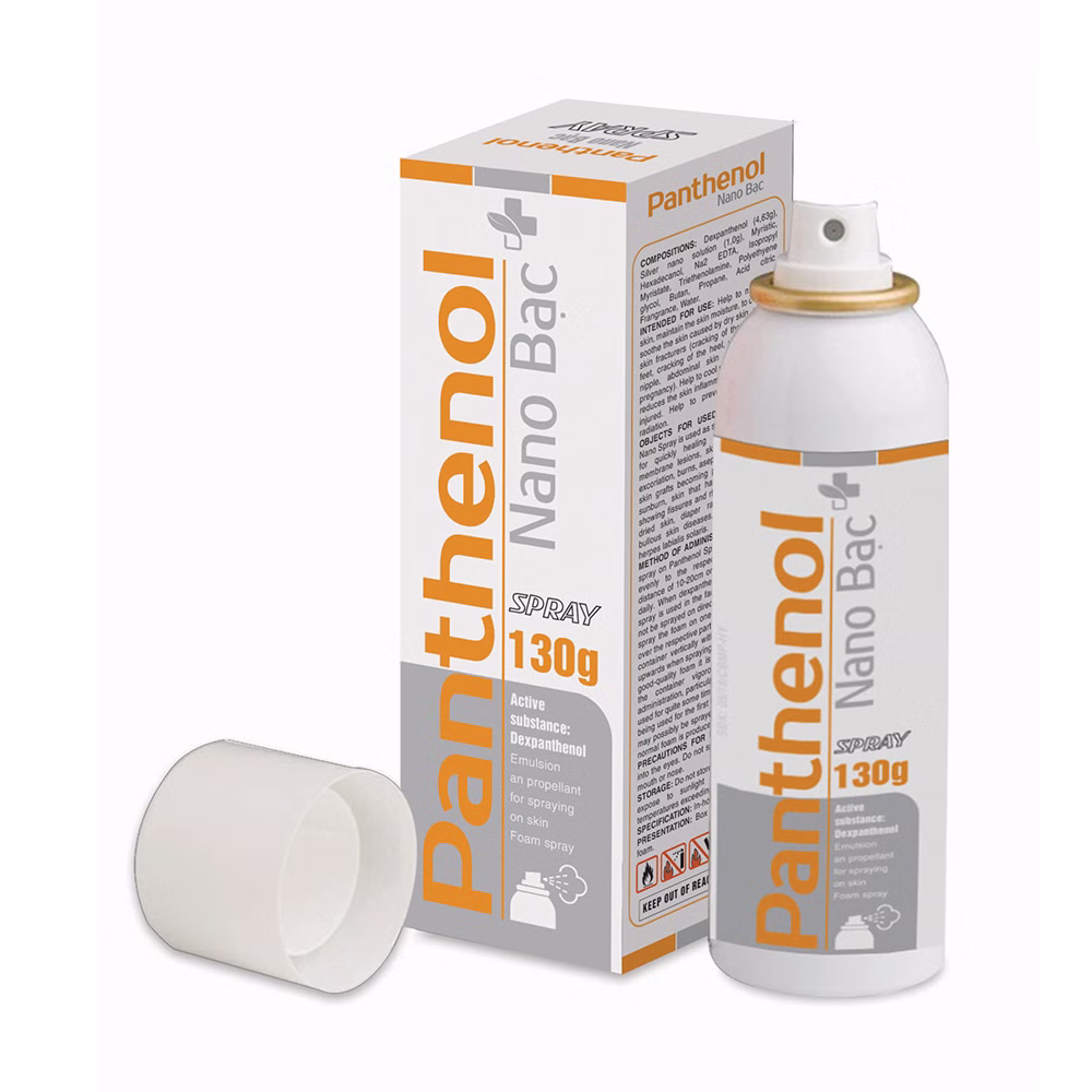 Xịt PANTHENOL Nano Bạc Spray làm mát da, dịu da và săn se da (Chai 130g) giúp dưỡng ẩm và làm mềm da, giảm tình trạng rát, khô, nứt nẻ (như nứt da chân, tay, gót chân, đầu vú, hoặc rạn da bụng do mang thai). Sản phẩm cũng làm mát và dịu da, giúp se khít da và giảm nguy cơ viêm nhiễm, tổn thương.
