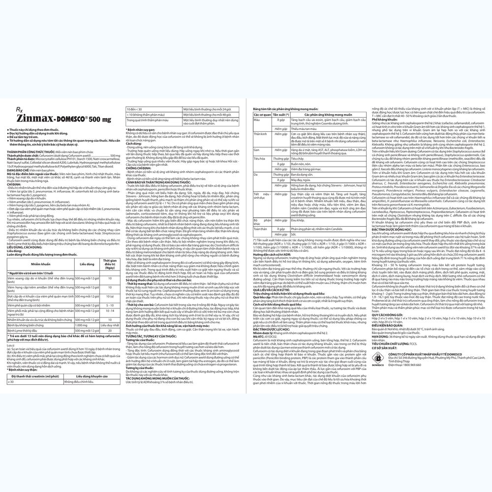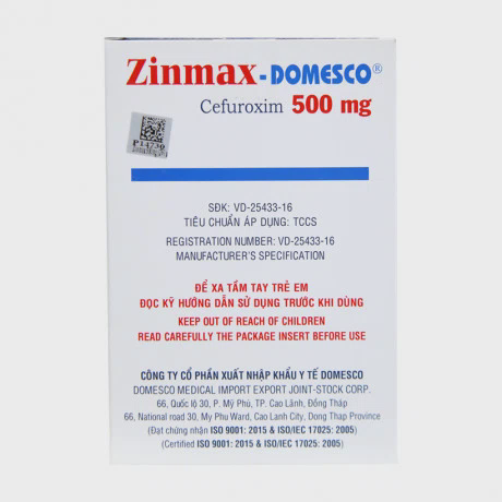 - Zinmax-Domesco 500mg là thuốc kháng sinh thuộc nhóm cephalosporin thế hệ II, được bào chế dưới dạng viên nén bao phim.